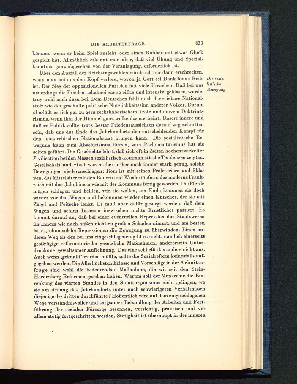 Über den Ausfall der Reichstagswahlen würde ich nur dann erschrecken,wenn man bei uns den Kopf verlöre, wovon ja Gott sei Dank keine Rede Die sozia-lst. Der Sieg der oppositionellen Parteien hat viele Ursachen. Daß bei uns listisckeneuerdings die Friedensschalmei gar so eifrig und intensiv geblasen wurde, ■® eM,e g un £trug wohl auch dazu bei. Dem Deutschen fehlt noch der reizbare National-stolz wie der geschulte politische Nützlichkeitssinn anderer Völker. Darumüberläßt er sich gar zu gern rechthaberischem Trotz und naivem Doktrina-rismus, wenn ihm der Himmel ganz wolkenlos erscheint. Unsere innere undäußere Politik sollte trotz bester Friedensaussichten darauf zugeschnittensein, daß uns das Ende des Jahrhunderts den entscheidenden Kampf fürden monarchischen Nationalstaat bringen kann. Die sozialistische Be-wegung kann zum Absolutismus führen, zum Parlamentarismus hat sieselten geführt. Die Geschichte lehrt, daß sich oft in Zeiten hochentwickelterZivilisation bei den Massen sozialistisch-kommunistische Tendenzen zeigten.Gesellschaft und Staat waren aber bisher noch immer stark genug, solcheBewegungen niederzuschlagen: Rom ist mit seinen Proletariern und Skla-ven, das Mittelalter mit den Bauern und Wiedertäufern, das moderne Frank-reich mit den Jakobinern wie mit der Kommune fertig geworden. Die Pferdemögen schlagen und beißen, wie sie wollen, am Ende kommen sie dochwieder vor den Wagen und bekommen wieder einen Kutscher, der sie mitZügel und Peitsche lenkt. Es muß aber dafür gesorgt werden, daß demWagen und seinen Insassen inzwischen nichts Ernstliches passiert. Eskommt darauf an, daß bei einer eventuellen Repression das Staatswesenim Innern wie nach außen nicht zu großen Schaden nimmt, und am bestenist es, ohne solche Repressionen die Bewegung zu überwinden. Einen an-deren Weg als den bei uns eingeschlagenen gibt es nicht, nämlich einerseitsgroßzügige reformatorische gesetzliche Maßnahmen, andererseits Unter-drückung gewaltsamer Auflehnung. Das eine schließt das andere nicht aus.