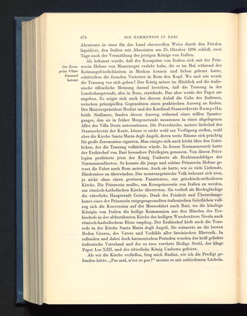 Als bekannt wurde, daß der Kronprinz von Italien sich mit der Prin-zessin Helene von Montenegro verlobt habe, die er im Mai während derKrönungsfeierlichkeiten in Moskau kennen und lieben gelernt hatte,schüttelten die fremden Vertreter in Rom den Kopf. Wo und wie werdedie Trauung vor sich gehen? Der König müsse im Hinblick auf die italie-nische öffentliche Meinung darauf bestehen, daß die Trauung in derLandeshauptstadt, also in Rom , stattfinde. Das aber werde der Papst niezugeben. Es zeigte sich auch bei diesem Anlaß die Gabe der Italiener,zwischen prinzipiellen Gegensätzen einen praktischen Ausweg zu finden.Der Ministerpräsident Rudini und der Kardinal-Staatssekretär Rampolla ,beide Sizilianer, fanden diesen Ausweg während eines stillen Spazier-ganges, den sie in früher Morgenstunde zusammen in einer abgelegenenAllee der Villa Doria unternahmen. Die Peterskirche, meinte lächelnd derStaatssekretär der Kurie, könne er nicht wohl zur Verfügung stellen, wohlaber die Kirche Santa Maria degli Angeli, deren weite Räume sich prächtigfür große Zeremonien eigneten. Man einigte sich auch leicht über den Geist-lichen, der die Trauung vollziehen würde. In ferner Normannenzeit hatteder Erzbischof von Bari besondere Privilegien genossen. Von diesen Privi-legien profitierte jetzt der König Umberto als Rechtsnachfolger derNormannenfürsten. So konnte die junge und schöne Prinzessin Helene ge-trost die Fahrt nach Rom antreten. Auch sie hatte, wie so viele Liebende,Hindernisse zu überwinden. Das montenegrinische Volk bekennt sich treu,ja nicht ohne einen gewissen Fanatismus, zur griechisch-orthodoxenKirche. Die Prinzessin mußte, um Kronprinzessin von Italien zu werden,zur römisch-katholischen Kirche übertreten. Sie verließ als Rechtgläubigedie väterliche Hauptstadt Cetinje . Dank der Feinheit und Überredungs-kunst eines der Prinzessin entgegengesandten italienischen Geistlichen voll-zog sich die Konversion auf der Meeresfahrt nach Bari , wo die künftigeKönigin von Italien die heilige Kommunion aus den Händen des Erz-bischofs in der altberühmten Kirche des heiligen Wundertäters Nicola nachrömisch-katholischem Ritus empfing. Der Erzbischof hielt auch die Trau-rede in der Kirche Santa Maria degli Angeli. Sie erinnerte an die bestenReden Ciceros , des Vaters und Vorbilds aller lateinischen Rhetorik. Inrollenden und dabei doch harmonischen Perioden wurden das heiß geliebteitalienische Vaterland und der so treu verehrte Heilige Stuhl, der klugePapst Leo XIII . und der ritterliche König Umberto gefeiert.