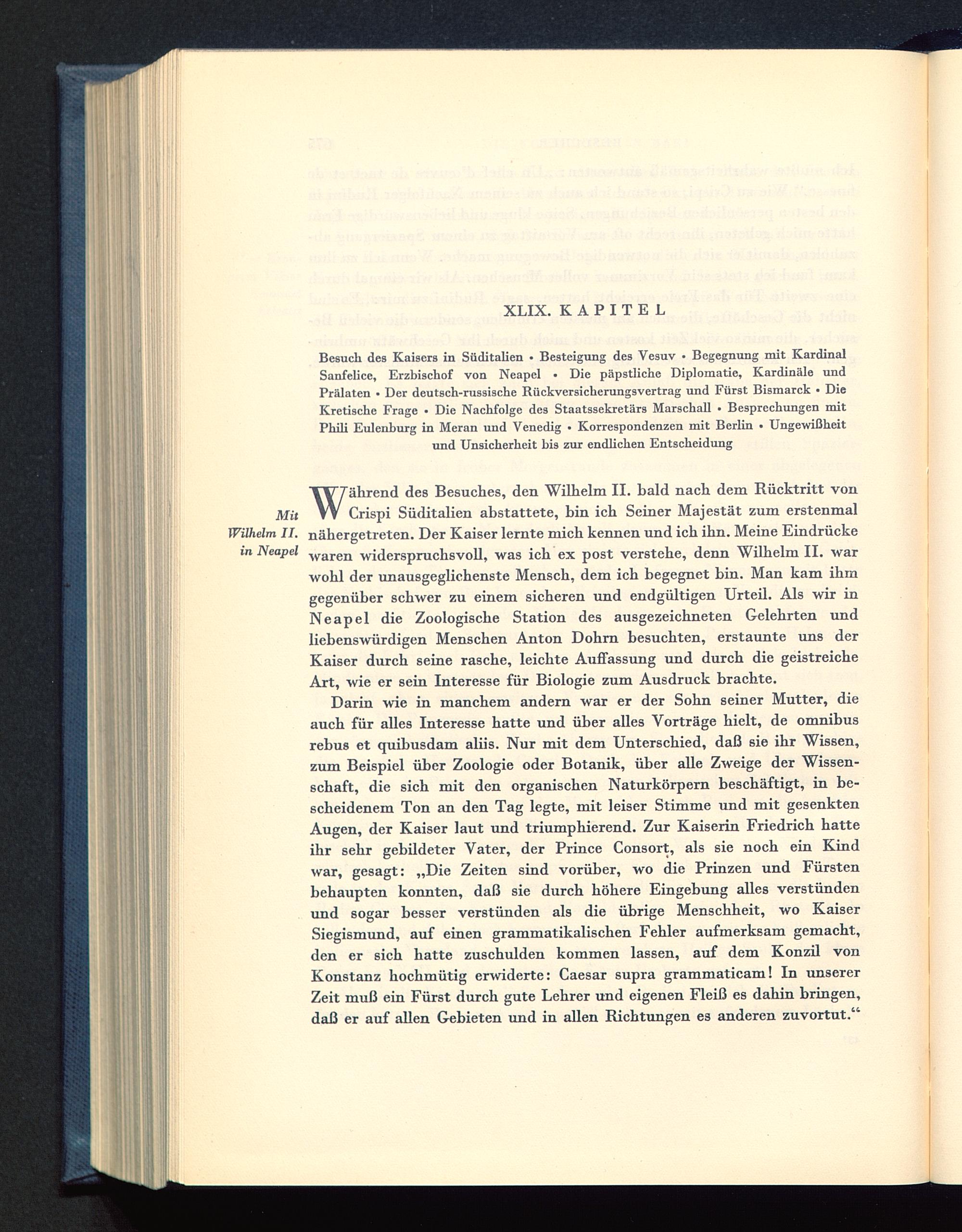 W ährend des Besuches, den Wilhelm II. bald nach dem Rücktritt vonCrispi Süditalien abstattete, bin ich Seiner Majestät zum erstenmalnähergetreten. Der Kaiser lernte mich kennen und ich ihn. Meine Eindrückewaren widerspruchsvoll, was ich ex post verstehe, denn Wilhelm II. warwohl der unausgeglichenste Mensch, dem ich begegnet bin. Man kam ihmgegenüber schwer zu einem sicheren und endgültigen Urteil. Als wir inNeapel die Zoologische Station des ausgezeichneten Gelehrten undliebenswürdigen Menschen Anton Dohrn besuchten, erstaunte uns derKaiser durch seine rasche, leichte Auffassung und durch die geistreicheArt, wie er sein Interesse für Biologie zum Ausdruck brachte.