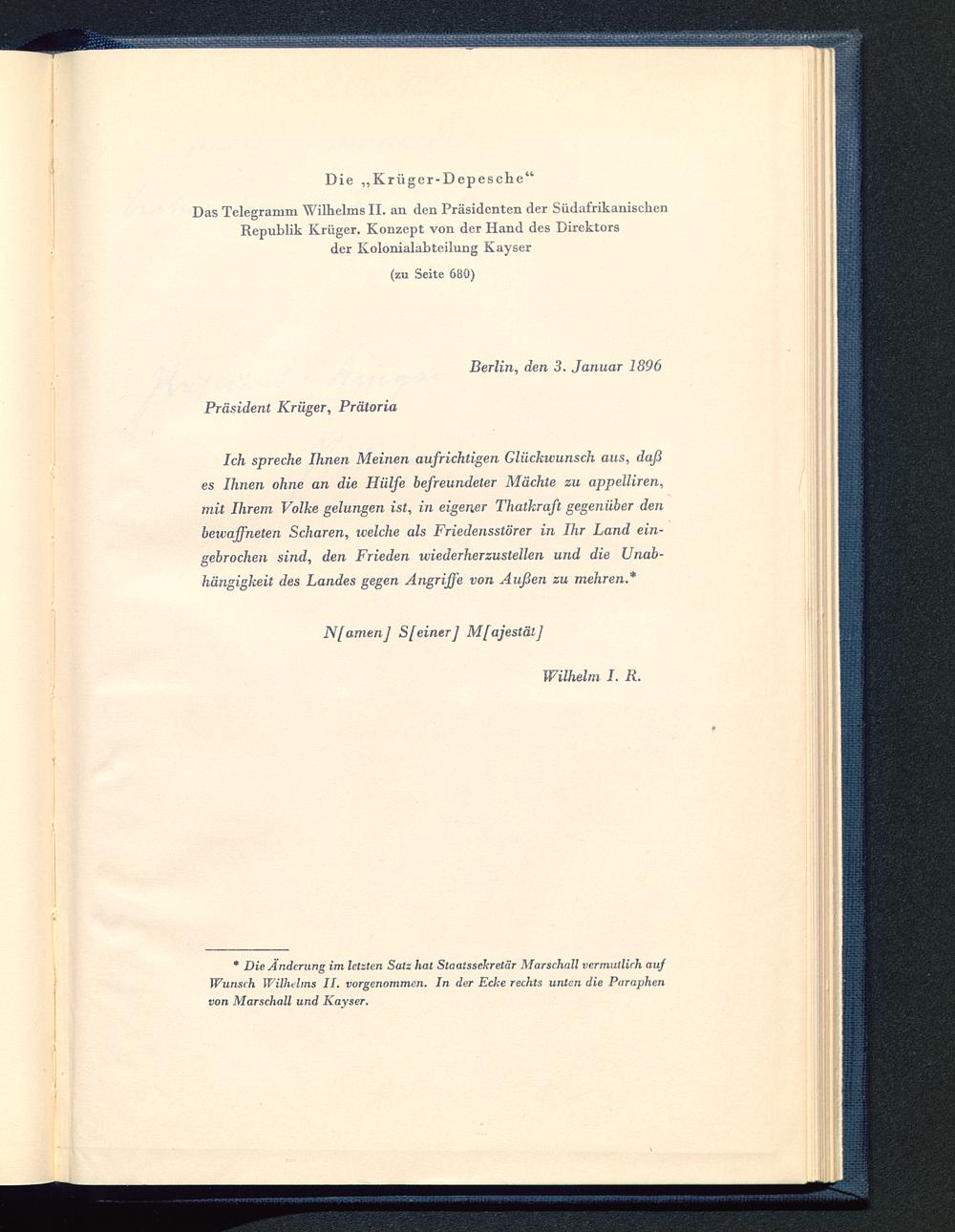 Das Telegramm Wilhelms II. an den Präsidenten der SüdafrikanischenRepublik Krüger. Konzept von der Hand des Direktorsder Kolonialabteilung Kayser