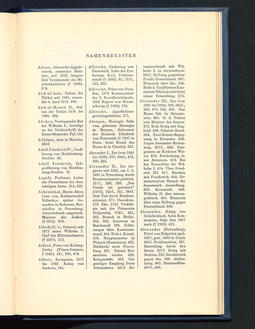 Alexander III. , Zar (von1881 bis 1894). 295, 365f„430, 479, 556, 565. NurRusse. 566. In Skiernie-wice. 569. D. A. Tolstoisein Minister des Innern.572. Kein Krieg mit Eng-land . 580. Schwere Hand.584. Zwei-Kaiser-Begeg-nung in Krcmsier. 586.Gegen Alexander Batten-berg . 587 f., 600. Tele-gramm an Katkows Wit-we. 612. Entdeckung ei-nes Attentats. 612. Beider Trauerfeier für Wil-helm I. 616. Über Fried-rich III. 617. Bündnismit Frankreich . 638. De-monstrativer Besuch derfranzösisch. Ausstellung.639. Kronstadt . 640.Wilhelm II. ihm unsym-pathisch. 641. Bismarck über seine Haltung gegenDeutschland . 680.