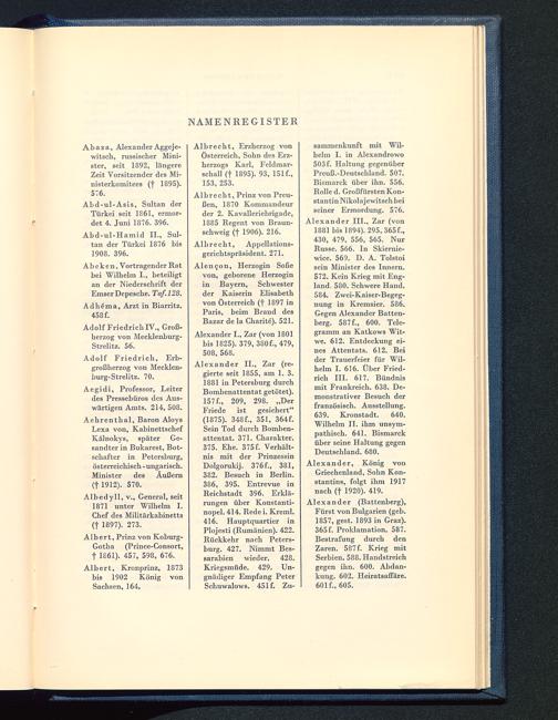 Alexander (Battenberg),Fürst von Bulgarien (geh.1857, gest. 1893 in Graz ).365 f. Proklamation. 587.Bestrafung durch denZaren. 587 f. Krieg mitSerbien . 588. Handstreichgegen ihn. 600. Abdan-kung. 602. Heiratsaffäre.601 f., 605.