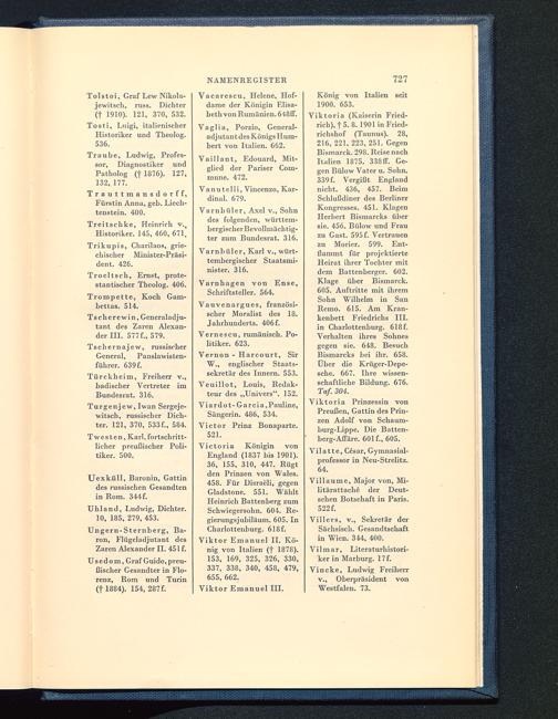 Viktoria (Kaiserin Fried-rich ), t 5. 8. 1901 in Fried-richshof (Taunus). 28,216, 221, 223, 251. GegenBismarck . 298. Reise nachItalien 1875. 338 ff. Ge-gen Bülow Vater u. Sohn.339 f. Vergißt England nicht. 436, 457. BeimSchlußdiner des BerlinerKongresses. 451. KlagenHerbert Bismarcks übersie. 456. Bülow und Frauzu Gast. 595 f. Vertrauenzu Morier. 599. Ent-flammt für projektierteHeirat ihrer Tochter mitdem Battenberger. 602.Klage über Bismarck .605. Auftritte mit ihremSohn Wilhelm in SanRemo. 615. Am Kran-kenbett Friedrichs III. in Charlottenburg . 618 f.Verhalten ihres Sohnesgegen sie. 648. BesuchBismarcks hei ihr. 658.Über die Krüger-Depe-sche. 667. Ihre wissen-schaftliche Bildung. 676.Taf. 304.