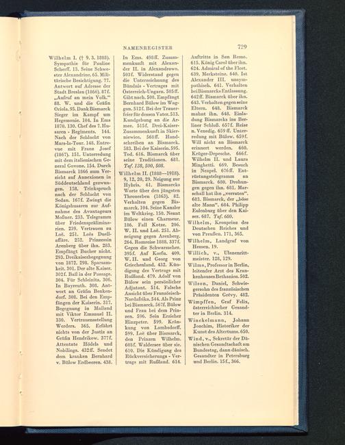 Wilhelm II. (1888—1918).9, 12, 20, 29. Neigung zurHybris. 61. BismarcksWorte über den jüngstenThronerben (1863). 82.Verhalten gegen Bis-marck . 104. Seine Kanzlerim Weltkrieg. 150. NenntBülow einen Charmeur.186. Fall Kotze. 206.W. II. und Loe. 251. Ab-neigung gegen Arenberg.264. Romreise 1888. 337 f.Gegen die Schwarzseher.395 f. Auf Korfu . 409.W. II. und Georg vonGriechenland . 432. Kün-digung des Vertrags mitRußland. 479. Adolf vonBülow sein persönlicherAdjutant. 514. FalscheAnsicht über Französisch-Nordafrika . 544. Als Prinzbei Bismarck. 567f. Bülowund Frau hei dem Prin-zen. 596. Sein ErzieherHinzpcter. 599. Krän-kung von Lambsdorff.599. Loe über Bismarck ,den Prinzen Wilhelm.608 f. Waldersee über sie.610. Die Kündigung desRückversicherungs - Ver-trags mit Rußland . 614.