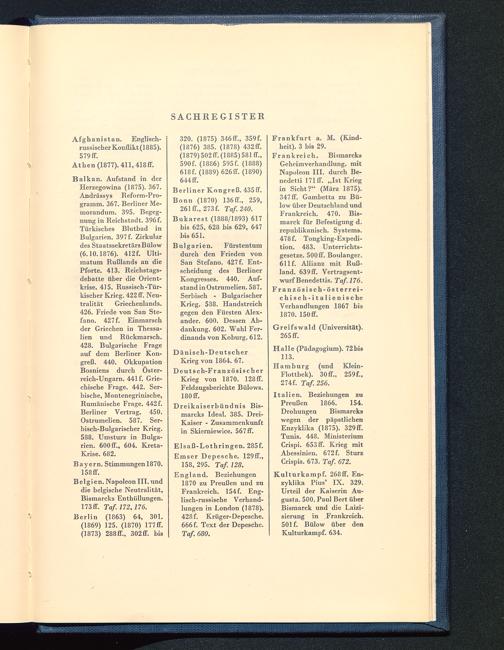 Frankreich . BismarcksGeheimverhandlung, mitNapoleon III. durch Be-nedetti 171 ff. „Ist Kriegin Sicht?“ (Mürz 1875).347 ff. Gambetta zu Bü-low über Deutschland undFrankreich. 470. Bis-marck für Befestigung d.republikanisch. Systems.478 f. Tongking-Expedi-tion. 483. Unterrichts-gesetze. 500 ff. Boulanger.61 lf. Allianz mit Ruß-land. 639 ff. Vertragsent-wurf Benedettis. Taf. 176.