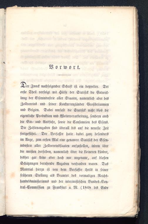 er Zweck nachfolgender Schrift ist ein doppelter. Dererste Theil verfolgt mit Hülfe der Statistik die Entwick-lung der Eisenindustrie aller Staaten, namentlich aber desZollvereins und seiner Konkurrenzländer Großbritannien und Belgien . Dabei umfaßt die Statistik nicht blos dieeigentliche Produktion und Weiterverarbeitung, sondern auchdie Ein- und Ausfuhr, sowie die Consumtion des Eisens.Die Zahlenangaben sind überall bis auf die neueste Zeitfortgeführt. Der Verfasser hatte dabei ganz besondersim Auge, zum ersten Mal eine genauere Statistik der Eisen-industrie aller Zollvereinöstaaten aufzustellen, indem überdie meisten derselben, namentlich über die kleineren Länder,bisher gar keine oder doch nur ungenaue, auf bloßenSchätzungen beruhende Angaben vorhanden waren. DasMaterial hierzu ist von dem Verfasser theils in seinerfrüheren Stellung als Beamter des vormaligen Neichs-handelsministeriums uud der interimistischen Bundes-Cen-tral-Commission zu Frankfurt a. M. (1848 bis Ende