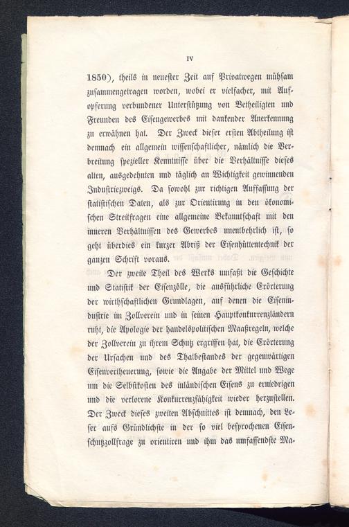 Der zweite Theil des Werks umfaßt die Geschichteund Statistik der Eisenzölle, die ausführliche Erörterungder wirthschaftlichen Grundlagen, auf denen die Eisenin-dustrie im Zollverein und in seinen Hauptkonkurrenzländernruht, die Apologie der handelspolitischen Maaßregeln, welcheder Zollverein zn ihrem Schutz ergriffen hat, die Erörterungder Ursachen und des Thatbestandes der gegenwärtigenEisenvertheuerung, sowie die Angabe der Mittel und Wegeum die Selbstkosten des inländischen Eisens zu erniedrigenund die verlorene Konkurrenzfähigkeit wieder herzustellen.Der Zweck dieses zweiten Abschnittes ist demnach, den Le-ser aufs Gründlichste in der so viel besprochenen Eisen-schutzzollfrage zu orientiren und ihm das umfassendste Ma-