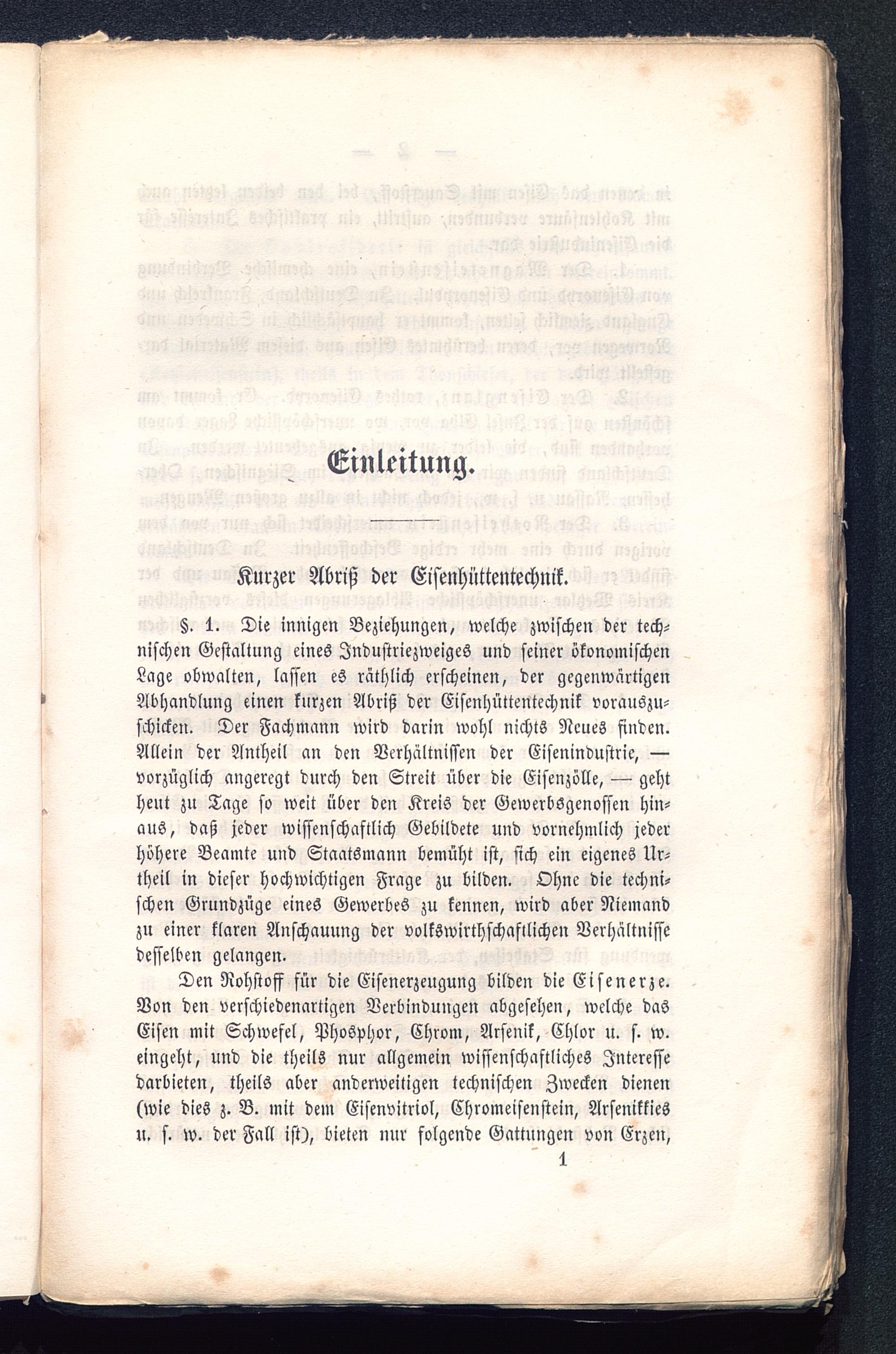§. 1. Die innigen Beziehungen, welche zwischen der tech-nischen Gestaltung eines Industriezweiges und seiner ökonomischenLage obwalten, lassen es räthlich erscheinen, der gegenwärtigenAbhandlung einen kurzen Abriß der Eisenhüttentechnik vorauszu-schicken. Der Fachmann wird darin wohl nichts Neues finden.Allein der Antheil an den Verhältnissen der Eisenindustrie, —vorzüglich angeregt durch den Streit über die Eisenzölle, — gehtheut zu Tage so weit über den Kreis der GewerbSgenossen hin-aus, daß jeder wissenschaftlich Gebildete und vornehmlich jederhöhere Beamte und Staatsmann bemüht ist, sich ein eigenes Ur-theil in dieser hochwichtigen Frage zu bilden. Ohne die techni-schen Grundzüge eines Gewerbes zu kennen, wird aber Niemandzu einer klaren Anschauung der volkswirthschafilichen Verhältnissedesselben gelangen.