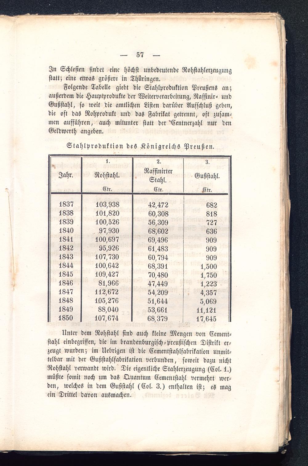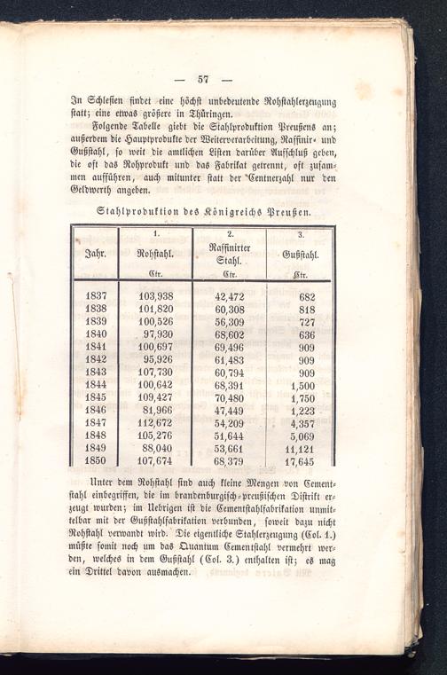Folgende Tabelle giebt die Stahlproduktion Preußens an;außerdem die Hauptprodukte der Weiterverarbeitung, Rasfinir- undGußstahl, so weit die amtlichen Liften darüber Aufschluß geben,die oft das Rohprodukt und das Fabrikat getrennt, oft zusam-men aufführen, auch mitunter statt der "Centnerzahl nur denGeldwerth angeben.