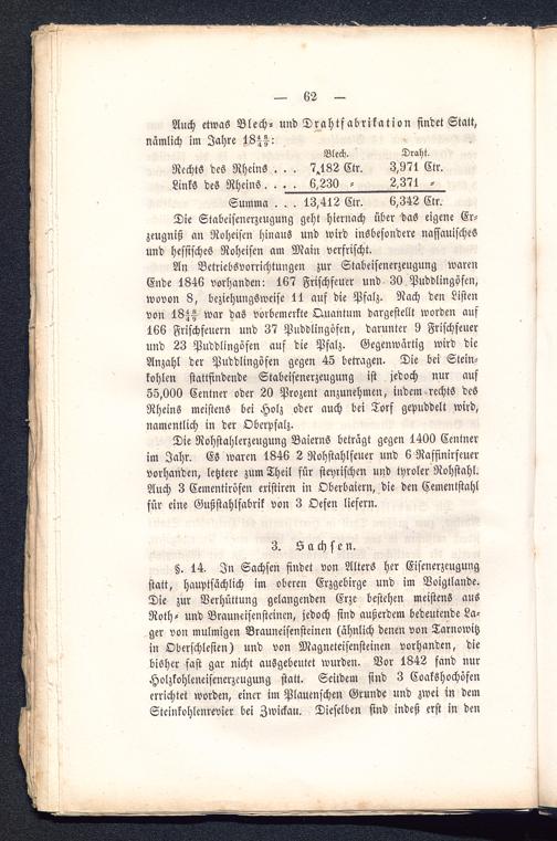K. 14. In Sachsen findet von Alters her Eisenerzeugungstatt, hauptsächlich im oberen Erzgebirge und im Voigtlande.Die zur Verhüttung gelangenden Erze bestehen meistens ausRoth- und Brauneisensteinen, jedoch sind außerdem bedeutende La-ger von mulmigen Brauneisensteinen (ähnlich denen von Tarnowitz in Oberschlesien ) und von Magneteisensteinen vorhanden, diebisher fast gar nicht ausgebeutet wurden. Vor 1842 fand nurHolzkohleneisenerzeugung statt. Seitdem sind 3 Coakshochöfenerrichtet worden, einer im Plauenschen Grunde und zwei in demSteinkohlenrevier bei Zwickau . Dieselben sind indeß erst in den