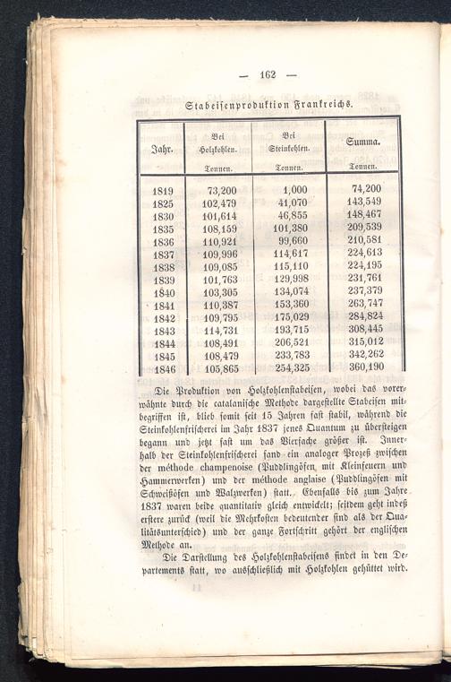 Die Produktion von Holzkohlenstabeisen, wobei das vorer-wähnte durch die catalcmische Methode dargestellte Stabeisen mit-begriffen ist, blieb somit seit 15 Jahren fast stabil, während dieSteinkohlenfrischerei im Jahr 1837 jenes Quantum zu übersteigenbegann und jetzt sast um das Vierfache größer ist. Inner-halb der Steinkohlenfrischerei fand ein analoger Prozeß zwischender irMIwäe ermmpenoise (Puddlingöfen mit Kleinfeuern undHammerwerken) und der nMwcls »n^Im'se (Puddlingöfen mitSchweißösen und Walzwerken) statt. Ebenfalls bis zum Jahre1837 waren beide quantitativ gleich entwickelt; seitdem geht indeßerstere zurück (weil die Mehrkosten bedeutender sind als der Qua-litätsunterschied) und der ganze Fortschritt gehört der englischenMethode an.