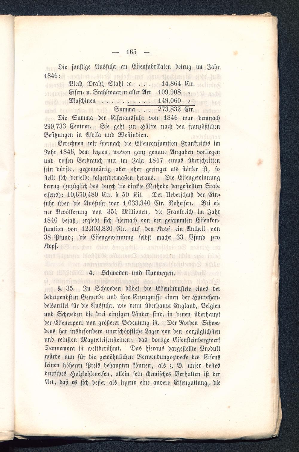 Berechnen wir hiernach die Eisenconsumtion Frankreichs imJahr 1846, dem letzten, wovon ganz genaue Angaben vorliegenund dessen Verbrauch nur im Jahr 1847 etwas überschrittensein dürfte, gegenwärtig aber eher geringer als stärker ist, sostellt sich derselbe folgendermaßen heraus. Die Eisengewinnungbetrug (zuzüglich des durch die direkte Methode dargestellten Stab-eisenö): 10,670,480 Ctr. k 50 Kil. Der Neberschuß der Ein-fuhr über die Ausfuhr war 1,633,340 Ctr. Roheisen. Bei ei-ner Bevölkerung von 35^ Millionen, die Frankreich im Jahr1846 besaß, ergiebt sich hiernach von der gesammten Eisenkon-sumtion von 12,303,820 Ctr. auf den Kopf ein Antheil von38 Pfund; die Eisengewinnung selbst macht 33 Psund proKopf.