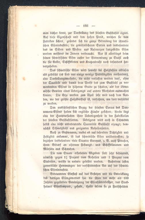 man bisher kennt, zur Darstellung des feinsten Gußstahls eignet.Auf diese Eigenschaft und den hohen Preis, welchen sie demFabrikate sichert, gründet sich die ganze Bedeutung der schwedi-schen Eisenindustrie; die gewöhnlicheren Sorten und insbesonderedas im Süden und Westen aus Rasenerzen dargestellte Eisenwerden meistens im Innern verbraucht. Nur ist allerdings beimfeinen schwedischen Eisen außer der Verwendung zu Stahl auchdie für Anker, Schiffsketten und Kratzendraht noch besonders her-vorzuheben.