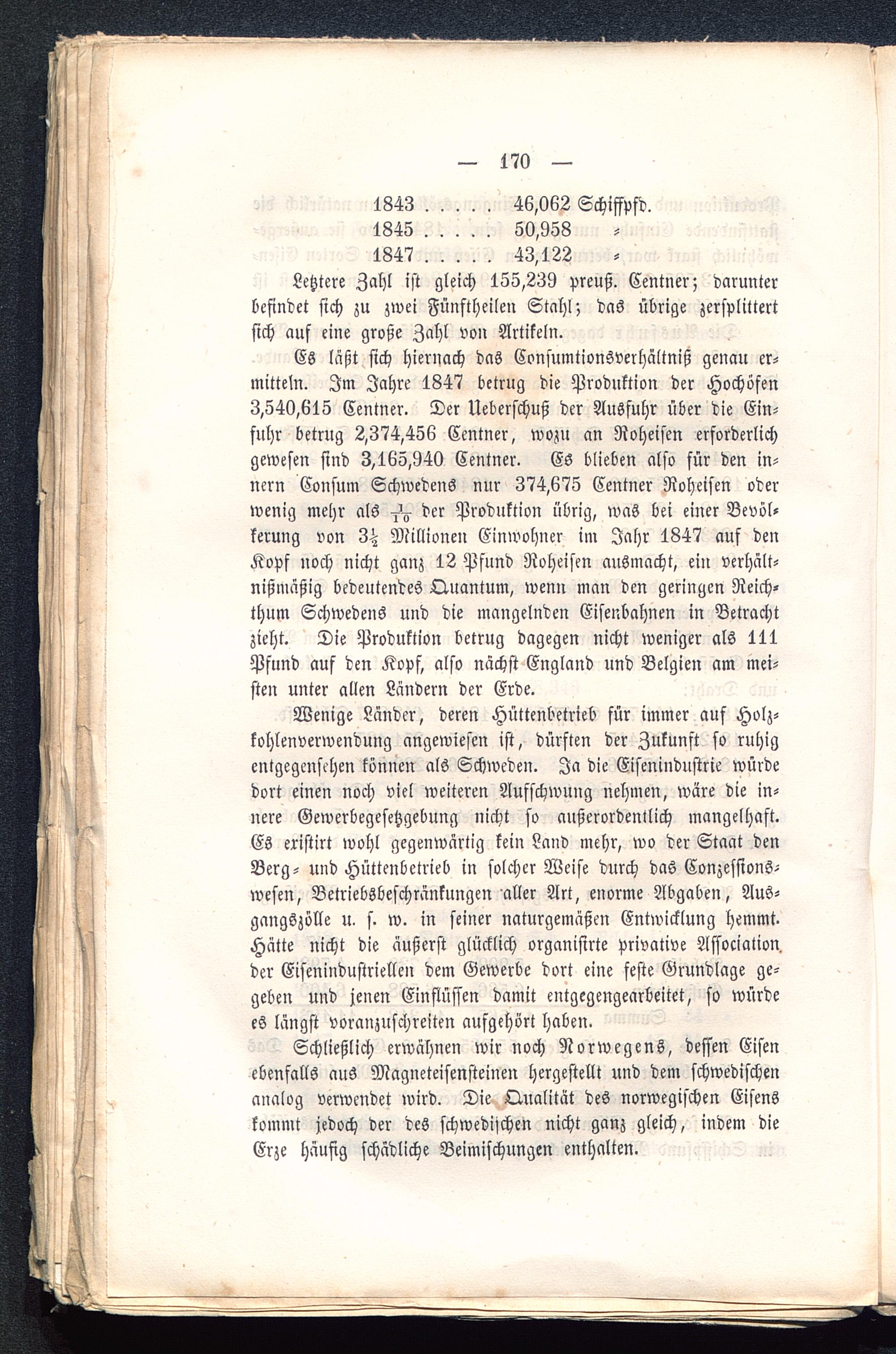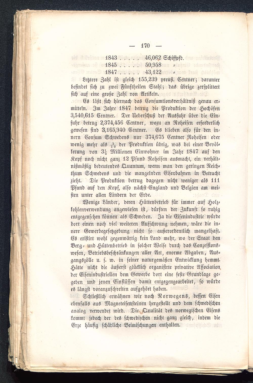 Es läßt sich hiernach das Consumtionsverhältniß genau er-mitteln. Im Jahre 1847 betrug die Produktion der Hochöfen3,540,615 Centner. Der Ueberschuß der Ausfuhr über die Ein-fuhr betrug 2,374,456 Centner, wozu an Roheisen erforderlichgewesen sind 3,165,940 Centner. Es blieben also für den in-nern Konsum Schwedens nur 374,675 Centner Roheisen oderwenig mehr als ^ der Produktion übrig, was bei einer Bevöl-kerung von 3^ Millionen Einwohner im Jahr 1847 auf denKopf noch nicht ganz 12 Pfund Roheisen ausmacht, ein verhält-nißmäßig bedeutendes Quantum, wenn man den geringen Reich-thum Schwedens und die mangelnden Eisenbahnen in Betrachtzieht. Die Produktion betrug dagegen nicht weniger als 111Pfund auf den Kopf, also nächst England und Belgien am mei-sten unter allen Ländern der Erde.