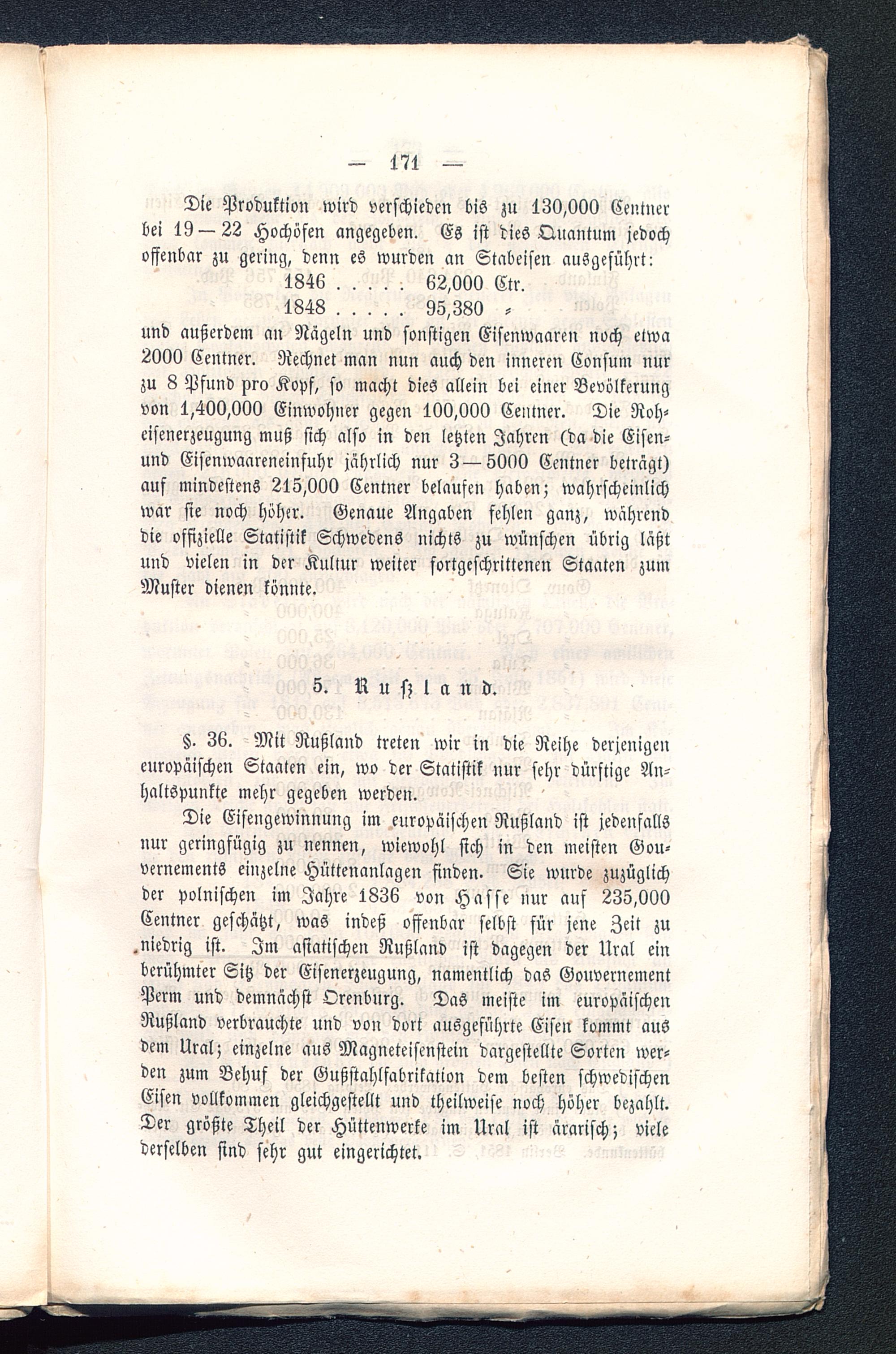 Die Produktion wird verschieden bis zu 130,000 Centnerbei 19 — 22 Hochöfen angegeben. Es ist dies Quantum jedochoffenbar zu gering, denn es wurden an Stabeisen ausgeführt: