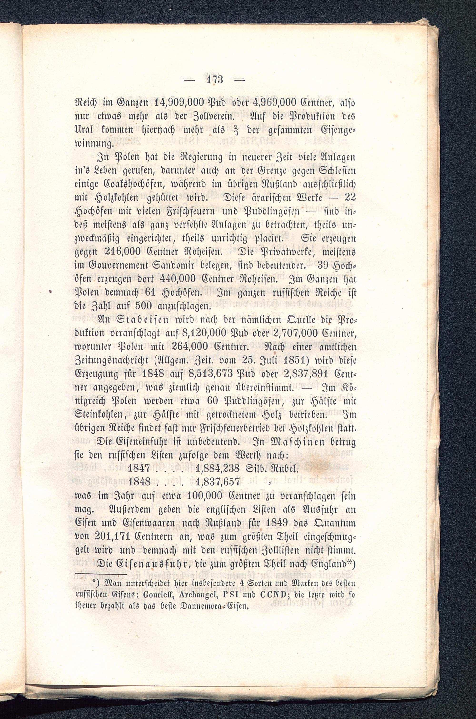 was im Jahr auf etwa 100,000 Centner zu veranschlagen seinmag. Außerdem geben die englischen Listen als Ausfuhr anEisen und Eisenwaaren nach Rußland für 1849 das Quantumvon 201,171 Centnern an, was zum größten Theil eingeschmug-gelt wird und demnach mit den russischen Zolllisten nicht stimmt.Die Eisen aus fuhr, die zum größten Theil nach England ")