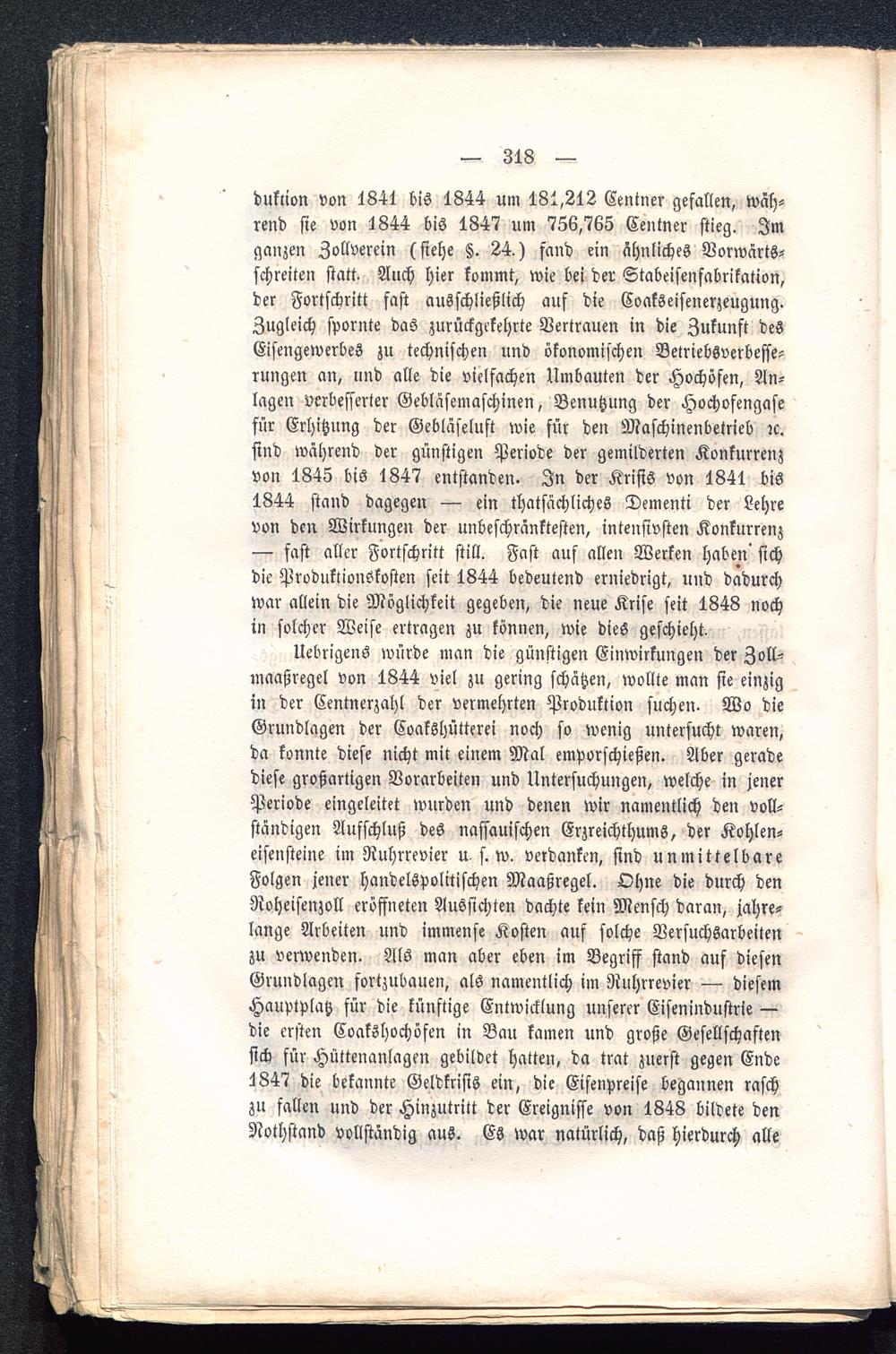 duknon von 1841 bis 1844 um 181,212 Centner gefallen, wäh-rend sie von 1844 bis 1847 um 756,765 Centner stieg. Imganzen Zollverein (siehe H. 24.) fand ein ähnliches Vorwärts-schreiten statt. Auch hier kommt, wie bei der Stabeisenfabrikation,der Fortschritt fast ausschließlich auf die Coakseisenerzeugung.Zugleich spornte das zurückgekehrte Vertrauen in die Zukunft desEisengewerbes zu technischen und ökonomischen Betriebsverbesse-rungen an, und alle die vielfachen Umbauten der Hochöfen, An-lagen verbesserter Gebläsemaschinen, Benutzung der Hochofengasefür Erhitzung der Gebläselust wie für den Maschinenbetrieb ?c.sind während der günstigen Periode der gemilderten Konkurrenzvon 1845 bis 1847 entstanden. In der Krisis von 1841 bis1844 stand dagegen — ein thatsächliches Dementi der Lehrevon den Wirkungen der unbeschränktesten, intensivsten Konkurrenz— fast aller Fortschritt still. Fast aus allen Werken haben' sichdie Produktionskosten seit 1844 bedeutend erniedrigt, und dadurchwar allein die Möglichkeit gegeben, die neue Krise seit 1848 nochin solcher Weise ertragen zu können, wie dies geschieht.