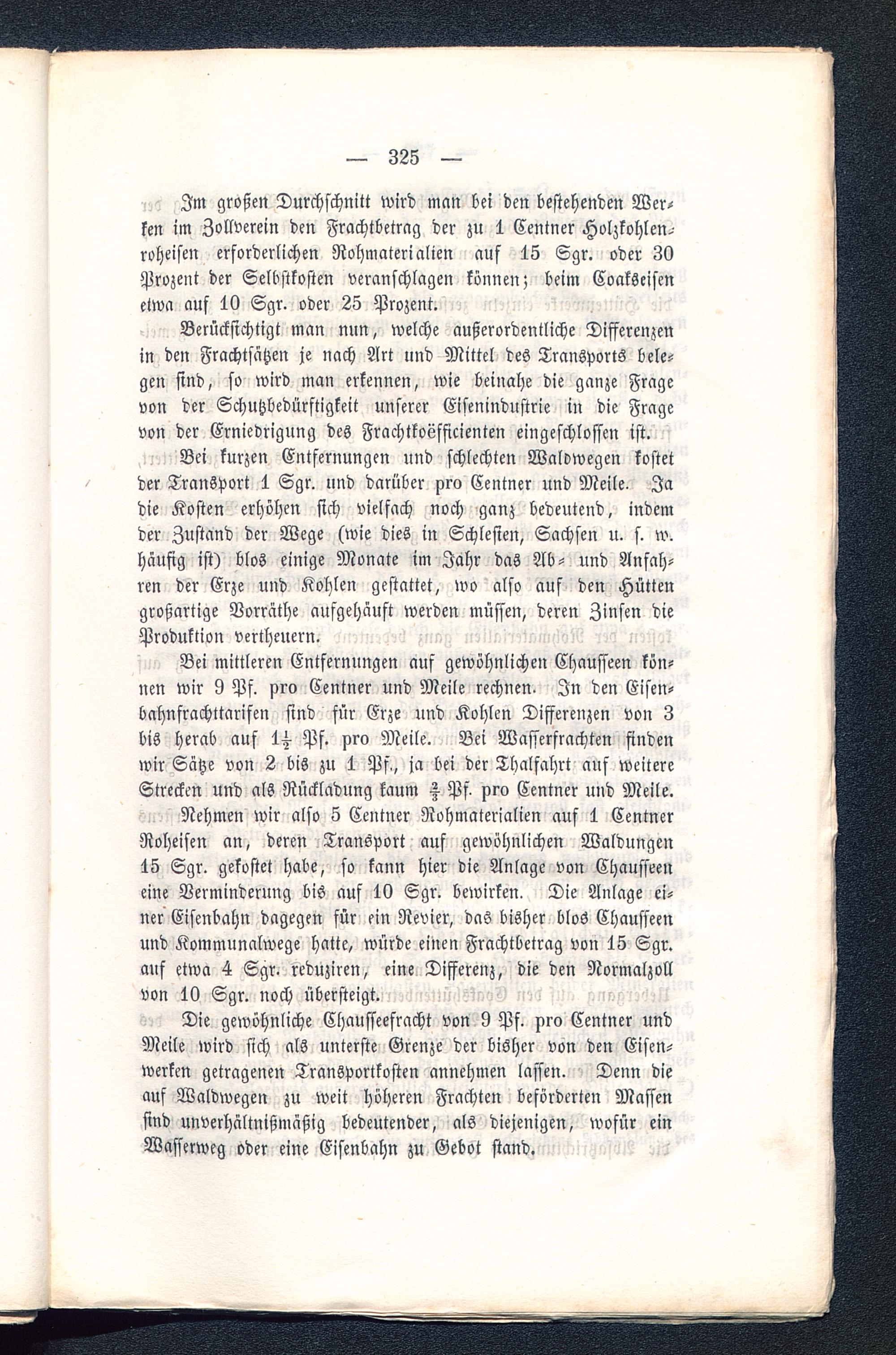 Bei kurzen Entfernungen und schlechten Waldwegen kostetder Transport 1 Sgr. und darüber pro Centner und Meile. Jadie Kosten erhöhen sich vielfach noch ganz bedeutend, indemder Zustand der Wege (wie dies in Schlesien , Sachsen u. s. w.häufig ist) blos einige Monate im Jähr das Ab- und Ansah-ren der Erze und Kohlen gestattet, wo also auf den Hüttengroßartige Vorräthe aufgehäuft werden müssen, deren Zinsen dieProduktion vertheuern.