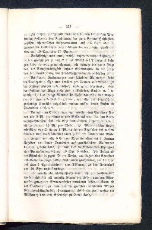 Nehmen wir also 5 Centner Rohmaterialien auf 1 CentnerRoheisen an, deren Transport auf gewöhnlichen Waldungen15 Sgr. gekostet habe, so kann hier die Anlage von Chausseeneine Verminderung bis auf 10 Sgr. bewirken. Die Anlage ei-ner Eisenbahn dagegen für ein Revier, das bisher blos Chausseenund Kommunalwege hatte, würde einen Frachtbetrag von 15 Sgr.auf etwa 4 Sgr. reduziren, eine Differenz, die den Normalzollvon 10 Sgr. noch übersteigt.