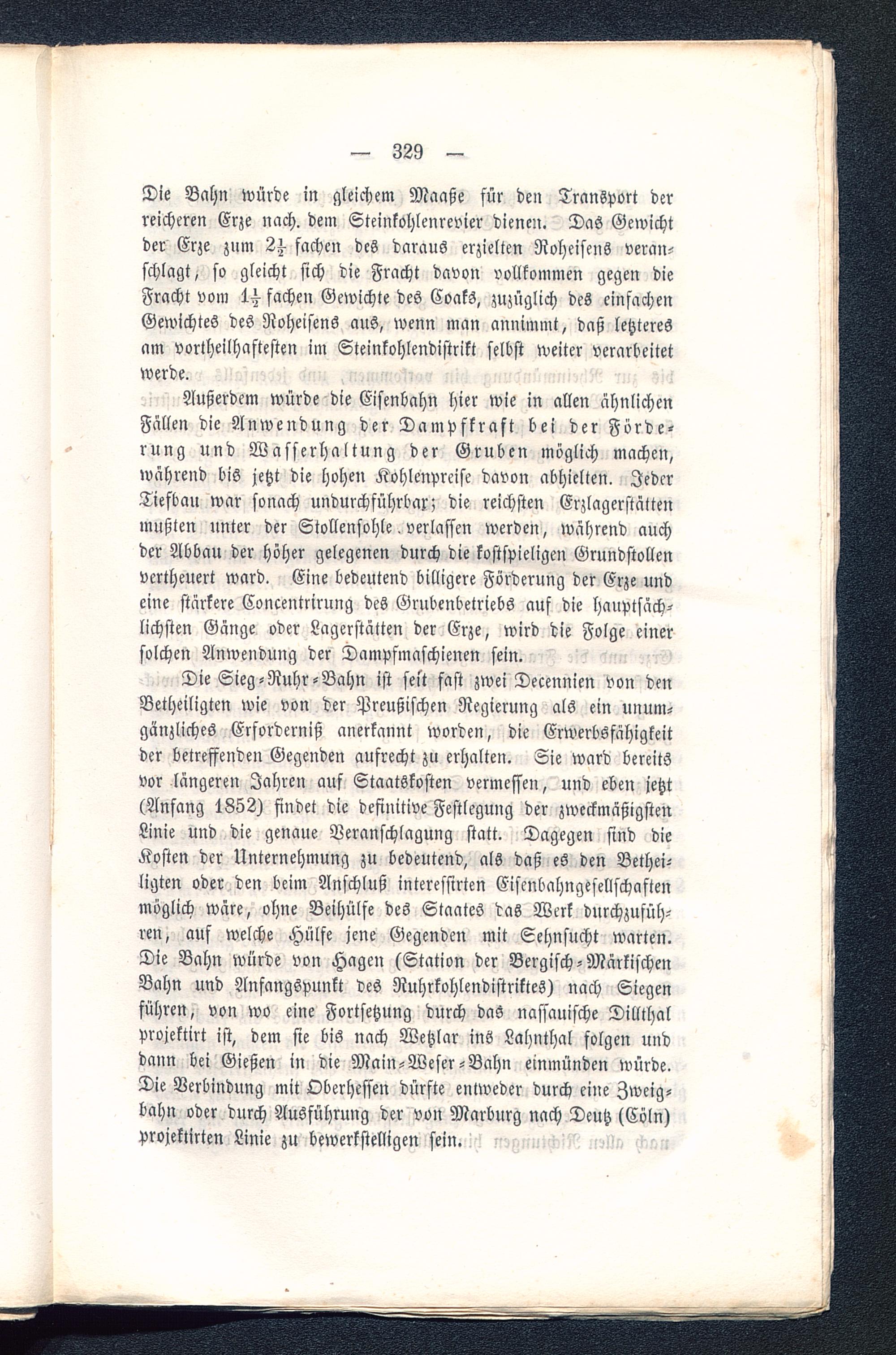Die Sieg-Ruhr-Bahn ist seit fast zwei Decennien von denBetheiligten wie von der Preußischen Regierung als ein unum-gänzliches Erforderniß anerkannt worden, die Erwerbsfähigkeitder betreffenden Gegenden aufrecht zu erhalten. Sie ward bereitsvor längeren Jahren auf Staatskosten vermessen, und eben jetzt(Ansang 1852) findet die definitive Festlegung der zweckmäßigstenLinie und die genaue Veranschlagung statt. Dagegen sind dieKosten der Unternehmung zu bedeutend, als daß es den Bethei-ligten oder den beim Anschluß interessirten Eisenbahngesellschaftenmöglich wäre, ohne Beihülfe des Staates das Werk durchzufüh-ren, auf welche Hülfe jene Gegenden mit Sehnsucht warten.Die Bahn würde von Hagen (Station der Bergisch-MärkischenBahn und Anfangspunkt des Nuhrkohlendistriktes) nach Siegenführen, von wo eine Fortsetzung durch das nassauische Dillthalprojektirt ist, dem sie bis nach Wetzlar ins Lahnthal folgen unddann bei Gießen in die Main-Weser-Bahn einmünden würde.Die Verbindung mit Oberhesfen dürfte entweder durch eine Zweig-bahn oder durch Ausführung der von Marburg nach Deutz (Cöln )projektirten Linie zu bewerkstelligen fein.