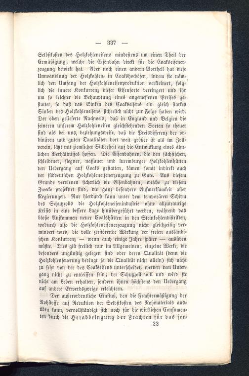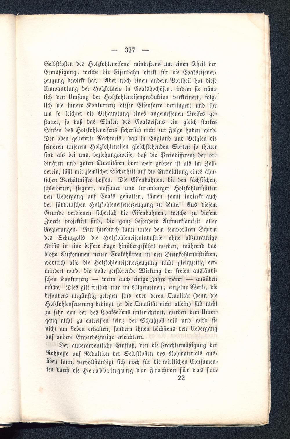Selbstkosten des Holzkohleneisens mindestens um einen Theil derErmäßigung, welche die Eisenbahn direkt für die Coakseisener-zeugung bewirkt hat. Aber noch einen andern Vortheil hat dieseUmwandlung der Holzkohlen- in Coakshochösm, indem sie näm-lich den Umfang der Holzkohleneisenproduktion verkleinert, folg-lich die innere Konkurrenz dieser Eisensorte verringert und ihrum so leichter die Behauptung eines angemessenen Preises ge-stattet, so daß das Sinken des CoakSeisens ein gleich starkesSinken des Holzkohleneisens sicherlich nicht zur Folge haben wird.Der oben gelieferte Nachweis, daß in England und Belgien diefeineren unserem Holzkohleneisen gleichstehenden Sorten so theuersind als bei uns, beziehungsweise, daß die Preisdifferenz der or-dinären und guten Qualitäten dort weit größer ist als im Zoll-verein, läßt mit ziemlicher Sicherheit auf die Entwicklung eines ähn-lichen Verhältnisses hoffen. Die Eisenbahnen, die den sächsischen,schleidener, siegner, nassauer und luremburger Holzkohlenhüttenden Uebergang auf Coaks gestatten, kämen somit indirekt auchder süddeutschen Holzkohleneisenerzeugung zu Gute. Aus diesemGrunde verdienen sicherlich die Eisenbahnen, welche zu diesemZwecke projektirt sind, die ganz besondere Aufmerksamkeit allerRegierungen. Nur hierdurch kann unter dem temporären Schirmdes Schutzzolls die Holzkohleneisenindustrie ohne allzutraurigeKrisis in eine bessere Lage hinübergeführt werden, während dasbloße Aufkommen neuer Coakshütten in den Steinkohlendistrikten,wodurch also die Holzkohleneisenerzeugung nicht gleichzeitig ver-mindert wird, die volle zerstörende Wirkung der freien ausländi-schen Konkurrenz — wenn auch einige Jahre später — ausübenmüßte. Dies gilt freilich nur im Allgemeinen; einzelne Werke, diebesonders ungünstig gelegen sind oder deren Qualität (denn dieHolzkohlenfeuerung bedingt ja die Qualität nicht allein) sich nichtzu sehr von der des Coakseisens unterscheidet, werden dem Unter-gang nicht zu entreissen sein; der Schutzzoll will und wird sienicht am Leben erhalten, sondern ihnen höchstens den Uebergangauf andere Erwerbszweige erleichtern.