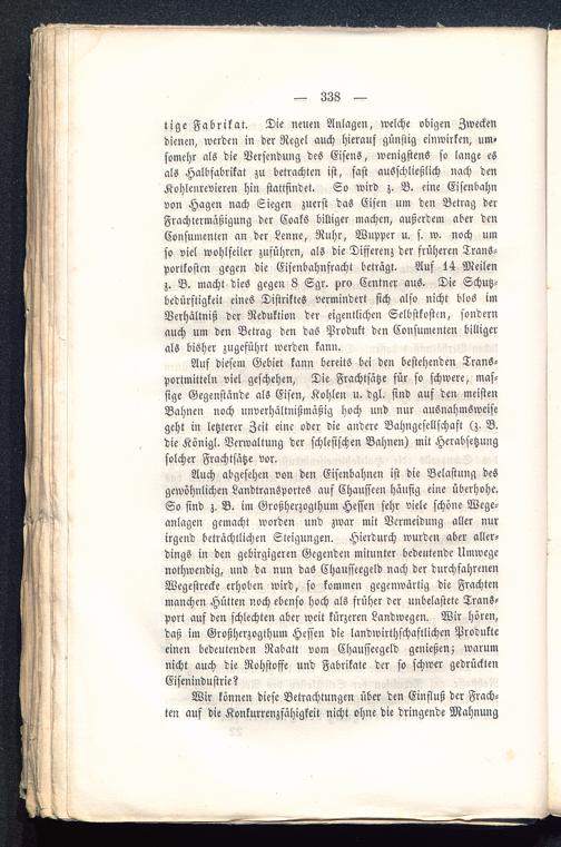 lige Fabrikat. Die neuen Anlagen, welche obigen Zweckendienen, werden in der Regel auch hierauf günstig einwirken, um-somehr als die Versendung des Eisens, wenigstens so lange esals Halbfabrikat zu betrachten ist, fast ausschließlich nach denKohlenrevieren hin stattfindet. So wird z. B. eine Eisenbahnvon Hagen nach Siegen zuerst das Eisen um den Betrag derFrachtermäßigung der Coaks billiger machen, außerdem aber denConsumenten an der Lenne, Ruhr, Wupper u. s. w. noch umso viel wohlfeiler zuführen, als die Differenz der früheren Trans-portkosten gegen die Eisenbahnfracht beträgt. Auf 14 Meilenz. B. macht dies gegen 8 Sgr. pro Centner aus. Die Schutz-bedürftigkeit eines Distriktes vermindert sich also nicht blos imVerhältniß der Reduktion der eigentlichen Selbstkosten, sondernauch um den Betrag den das Produkt den Consumenten billigerals bisher zugeführt werden kann.