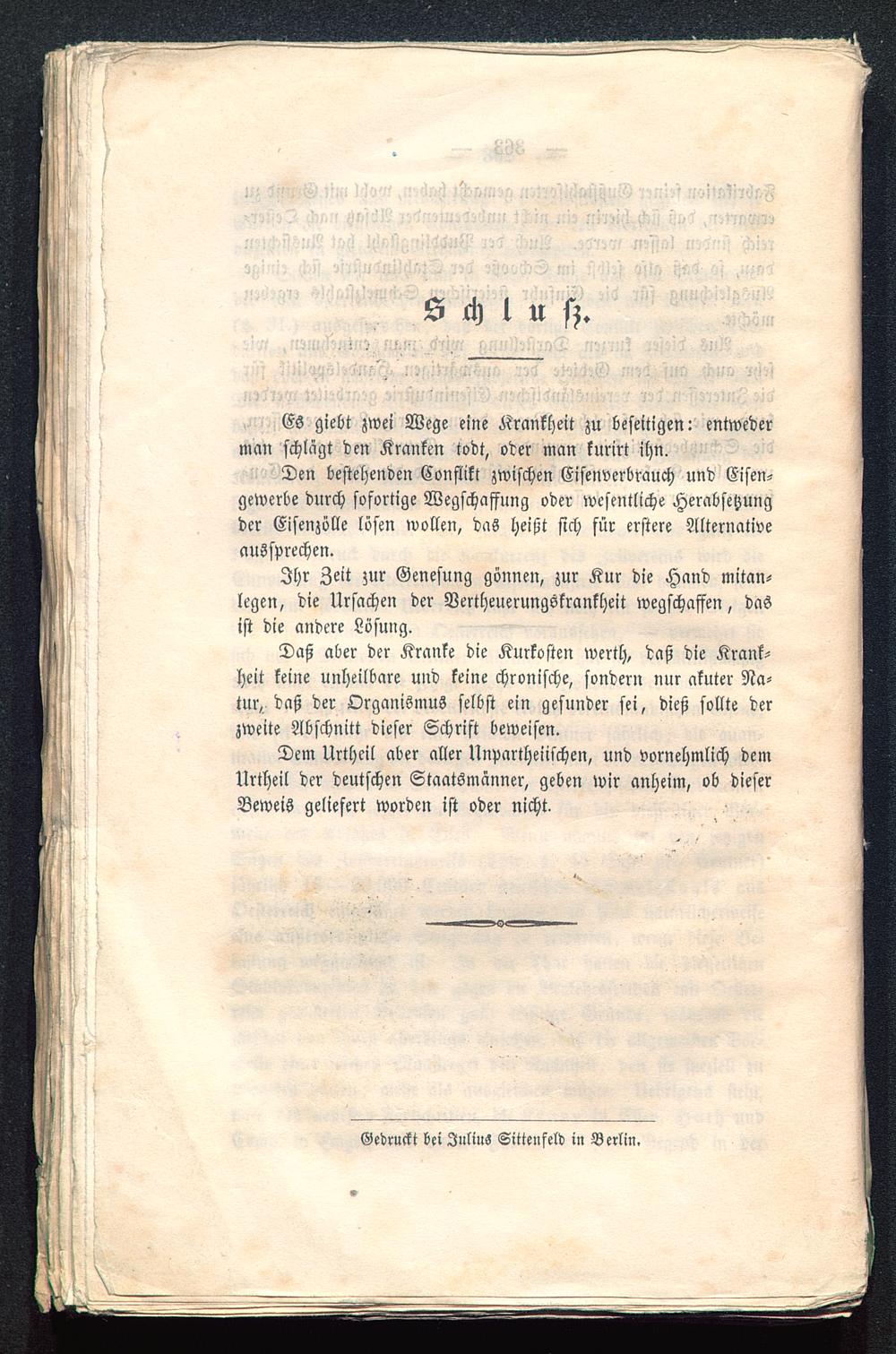 Den bestehenden Conflikt zwischen Eisenverbrauch und Eisen-gewerbe durch sofortige Wegschaffung oder wesentliche Herabsetzungder Eisenzölle lösen wollen, das heißt sich für erstere Alternativeaussprechen.