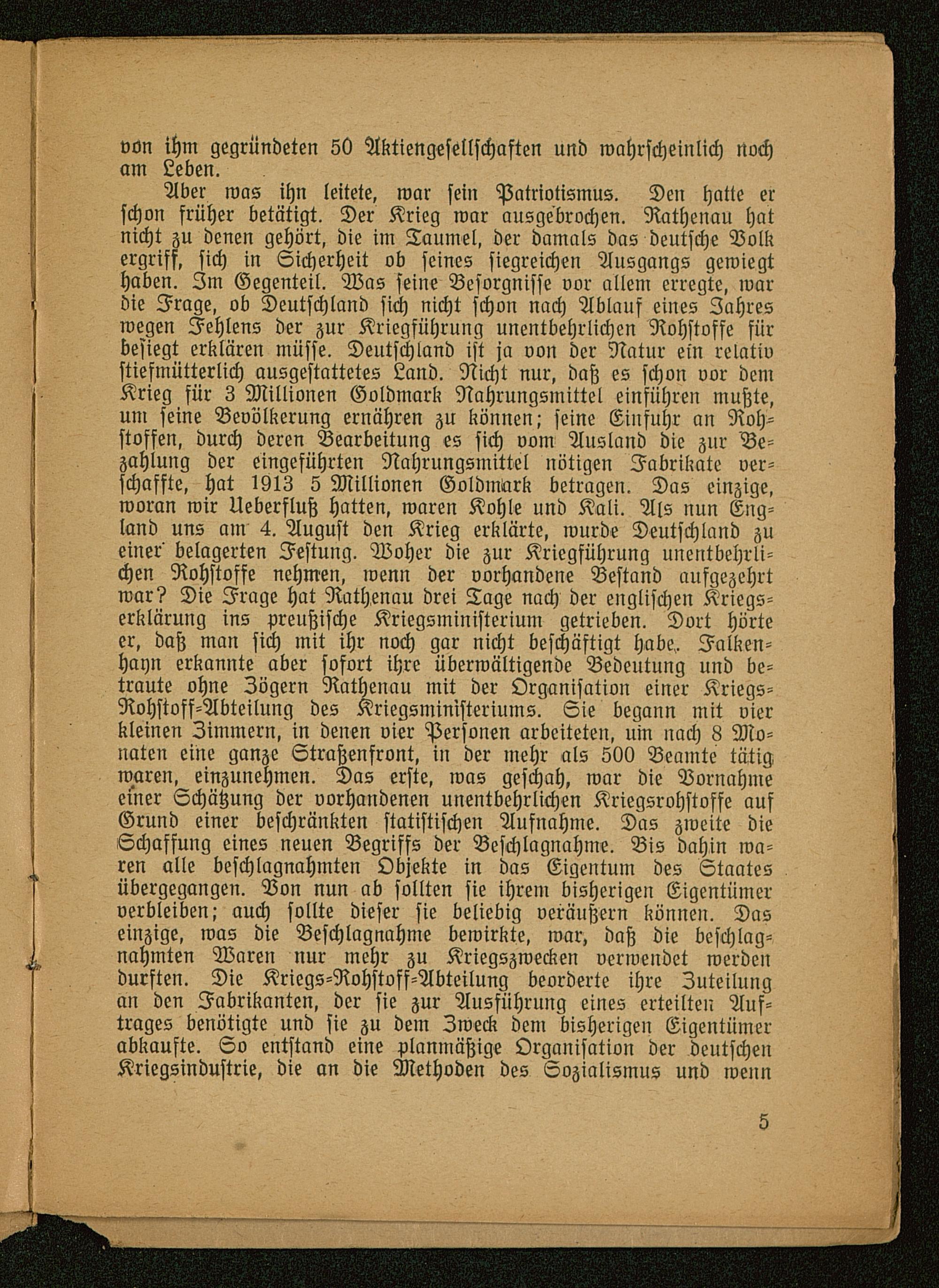 Aber was ihn leitete, war sein Patriotismus. Den hatte erschon früher betätigt. Der Krieg war ausgebrochen. Rathenau hatnicht zu denen gehört, die im Taumel, der damals das deutsche Volkergriff, sich in Sicherheit ob seines siegreichen Ausgangs gewiegthaben. 3m Gegenteil. Was seine Besorgnisse vor allem erregte, wardie Frage, ob Deutschland sich nicht schon nach Ablauf eines Jahreswegen Fehlens der zur Kriegführung unentbehrlichen Rohstoffe fürbesiegt erklären müsse. Deutschland ist ja von der Natur ein relativstiefmütterlich ausgestattetes Land. Nicht nur, daß es schon vor demKrieg für 3 Millionen Goldmark Nahrungsmittel einführen mußte,um seine Bevölkerung ernähren zu können,- seine Einfuhr an Roh-stoffen, durch deren Bearbeitung es sich vom Ausland die znr Be-zahlung der eingeführten Nahrungsmittel nötigen Fabrikate ver-fchafste, hat 1913 5 Millionen Goldmark betragen. Das einzige,woran wir Ueberfluß hatten, waren Kohle und Kali. Als nun Eng-land uns am 4. August den Krieg erklärte, wurde Deutschland zueiner' belagerten Festung. Woher die zur Kriegführung unentbehrli-chen Rohstoffe nehmen, wenn der vorhandene Bestand aufgezehrtwar? Die Frage hat Rathenau drei Tage nach der englischen Kriegs-erklärung ins preußische Kriegsministerium getrieben. Dort hörteer, daß man sich mit ihr noch gar nicht beschäftigt habe. Falken-hann erkannte aber sofort ihre überwältigende Bedeutung und be-traute ohne Zögern Rathenau mit der Organisation einer Kriegs-Rohstoff-Abteilung des Kriegsmimsteriums. Sie begann mit vierkleinen Zimmern, in denen vier Personen arbeiteten, um nach 8 Mo-naten eine ganze Straßenfront, in der mehr als 500 Beamte tätigwaren, einzunehmen. Das erste, was geschah, war die Bornahmeeiner Schätzung der vorhandenen unentbehrlichen Kriegsrohstoffe aufGrund einer beschränkten statistischen Aufnahme. Das zweite dieSchaffung eines neuen Begriffs der Beschlagnahme. Bis dahin wa-ren alle beschlagnahmten Objekte in das Eigentum des Staatesübergegangen. Von nun ab sollten sie ihrem bisherigen Eigentümerverbleiben,- auch sollte dieser sie beliebig veräußern können. Daseinzige, was die Beschlagnahme bewirkte, war, daß die beschlag-nahmten Waren nur mehr zu Kriegszwecken verwendet werdendurften. Die Kriegs-Rohstoff-Abteilung beorderte ihre Zuteilungan den Fabrikanten, der sie zur Ausführung eines erteilten Auf-trages benötigte und sie zu dem Zweck dem bisherigen Eigentümerabkaufte. So entstand eine planmäßige Organisation der deutschen Kriegsindustrie, die an die Methoden des Sozialismus und wenn