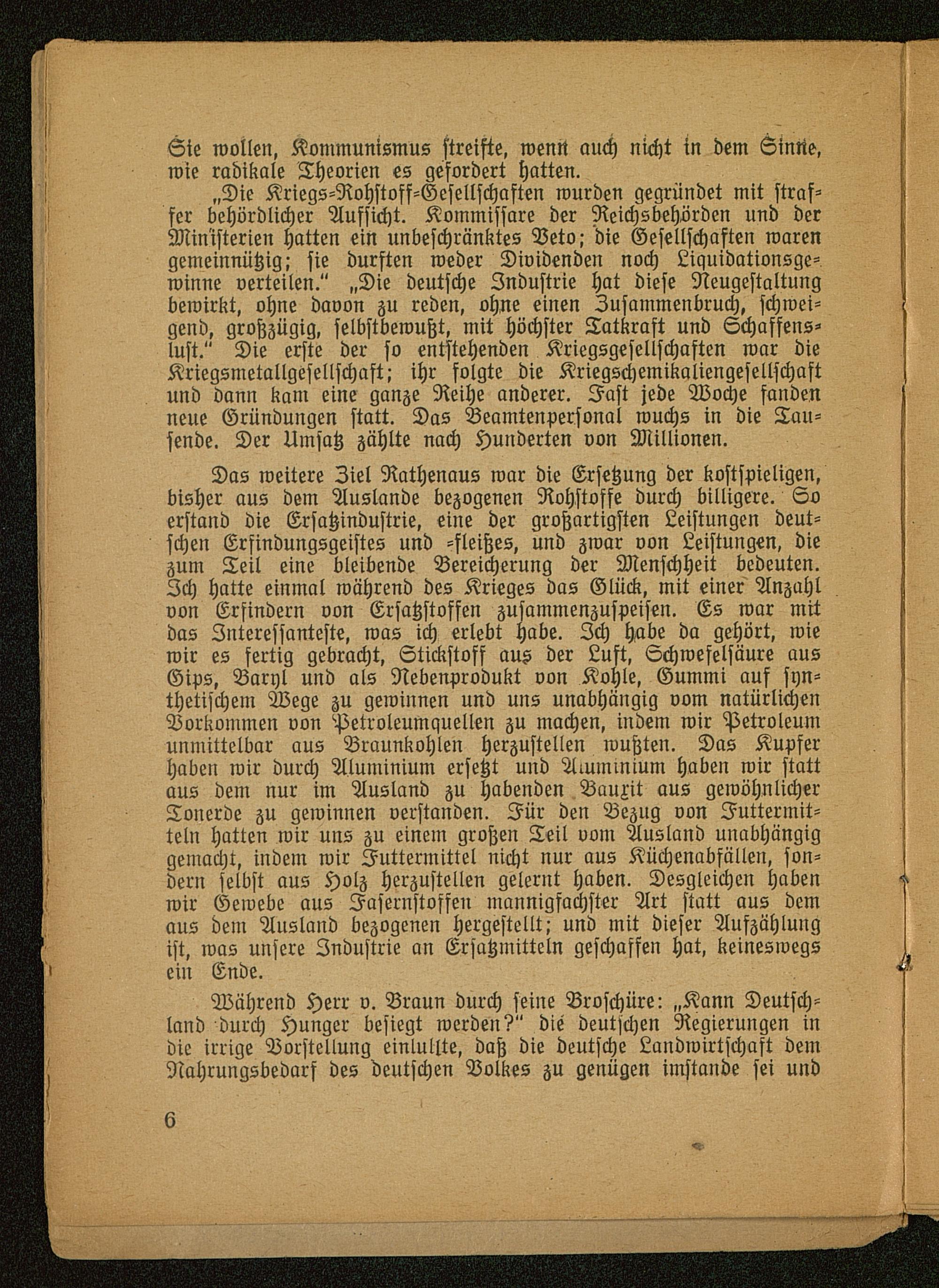 Während Herr v. Braun durch seine Broschüre: „Kann Deutsch-land durch Hunger besiegt werden?" die deutschen Regierungen indie irrige Vorstellung einlullte, daß die deutsche Landwirtschaft demNahrungsbedarf des deutschen Volkes zu genügen imstande sei und
