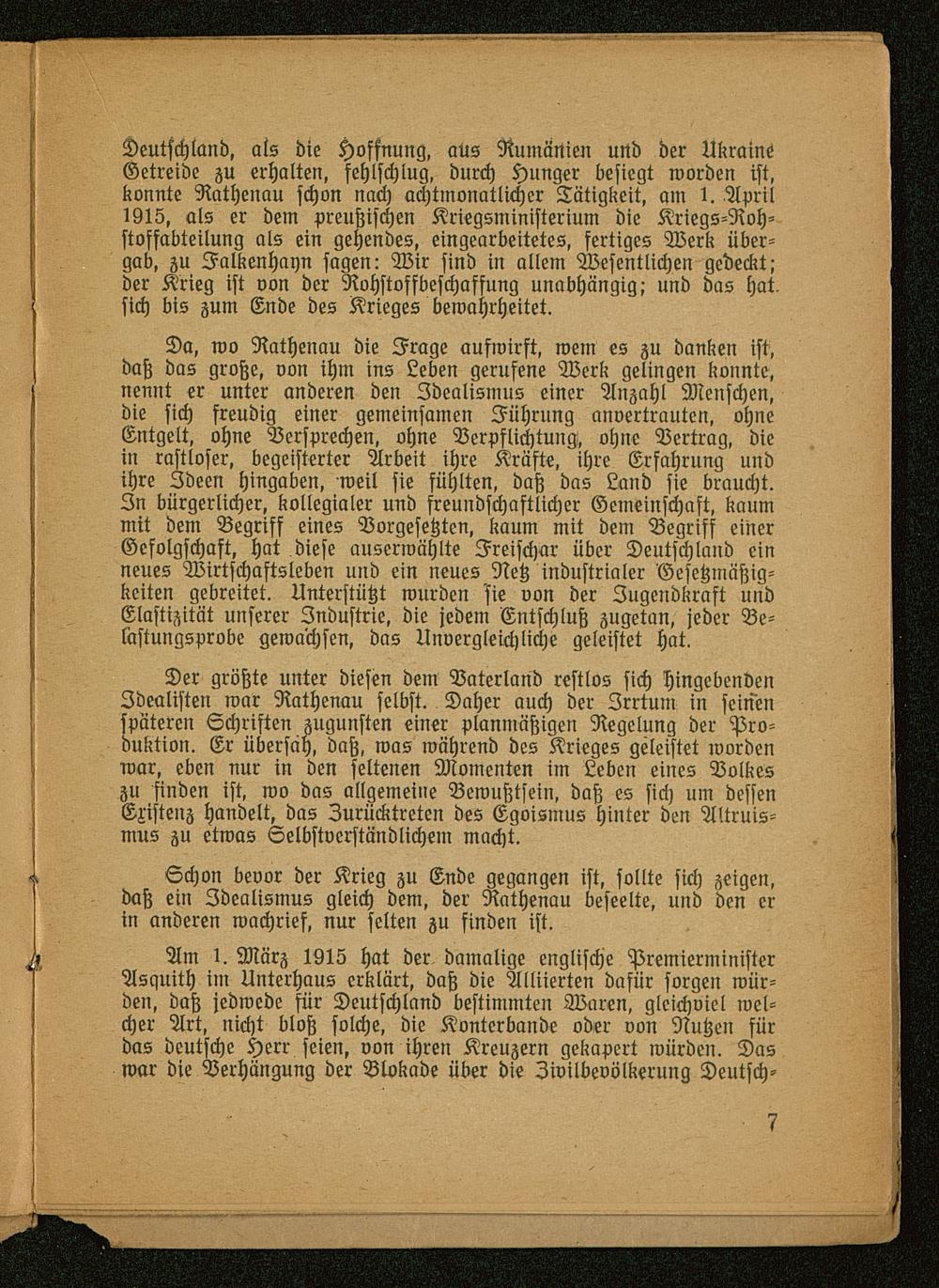 Deutschland, als die Hoffnung, aus Rumänien und der Ukraine Getreide zu erhalten, fehlschlug, durch Hunger besiegt worden ist,konnte Rathenau schon nach achtmonatlicher Tätigkeit, ym 1. Aprilt915, als er dem preußischen Kriegsministerium die Kriegs-Roh-stoffabteilung als ein gehendes, eingearbeitetes, fertiges Werk über-gab, zu Falkenhayn sagen: Wir sind in allem Wesentlichen gedeckt;der Krieg ist von der Rohstoffbeschaffung unabhängig; und das hat.sich bis zum Ende des Krieges bewahrheitet.
