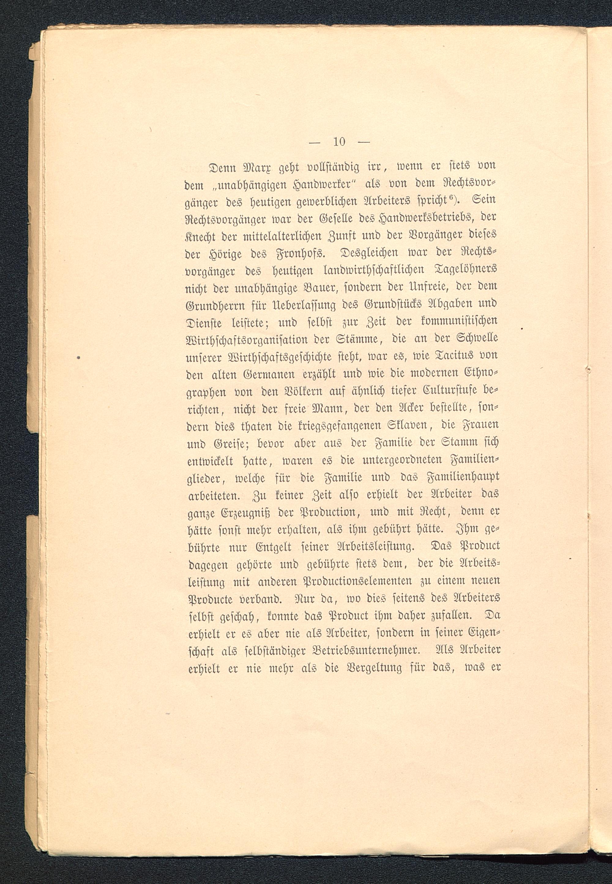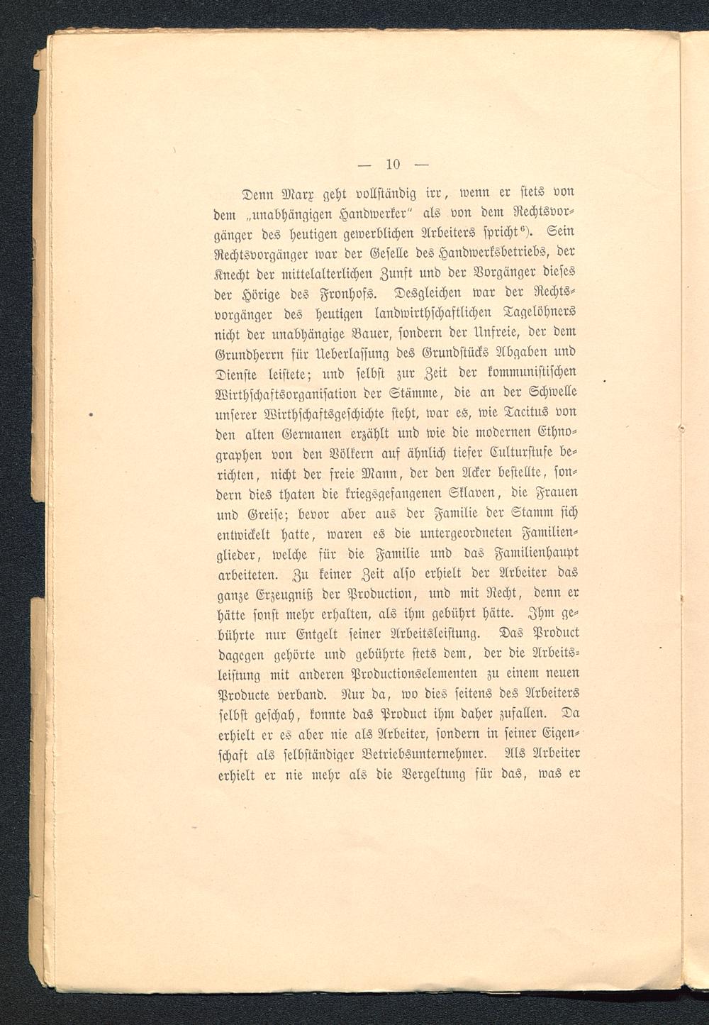 Denn Marx geht vollständig irr, wenn er stets vondem „unabhängigen Handwerker" als von dem Rechtsvor-gänger des heutigen gewerblichen Arbeiters spricht"). SeinRechtsvorgänger war der Geselle des Handwerksbetriebs, derKnecht der mittelalterlichen Zunft und der Vorgänger diesesder Hörige des Fronhofs. Desgleichen war der Rechts-vorgänger des heutigen landwirtschaftlichen Tagelöhnersnicht der unabhängige Bauer, sondern der Unfreie, der demGrundherrn für Ueberlassung des Grundstücks Abgaben undDienste leistete; und selbst zur Zeit der kommunistischen Wirthschaftsorganisation der Stämme, die an der Schwelleunserer Wirthschaftsgeschichte steht, war es, wie Tacitus vonden alten Germanen erzählt und wie die modernen Ethno-graphen von den Völkern auf ähnlich tiefer Culturstufe be-richten, nicht der freie Mann, der den Acker bestellte, son-dern dies thaten die kriegsgefangenen Sklaven, die Frauenund Greise; bevor aber aus der Familie der Stamm sichentwickelt hatte, waren es die untergeordneten Familien-glieder, welche sür die Familie und das Familienhauptarbeiteten. Zu keiner Zeit also erhielt der Arbeiter dasganze Erzeugniß der Production, und mit Recht, denn erhätte sonst mehr erhalten, als ihm gebührt hätte. Ihm ge-bührte nur Entgelt seiner Arbeitsleistung. Das Productdagegen gehörte und gebührte stets dem, der die Arbeits-leistung mit anderen Productionselementen zu einem neuenProducte verband. Nur da, wo dies seitens des Arbeitersselbst geschah, konnte das Product ihm daher zufallen. Daerhielt er es aber nie als Arbeiter, sondern in seiner Eigen-schaft als selbständiger Betriebsunternehmer. Als Arbeitererhielt er nie mehr als die Vergeltung für das, was er