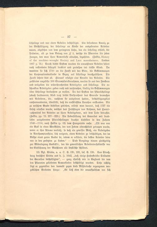 Lehrlinge und nur einen Arbeiter beschäftigte. Ein besonderer Anreiz zuder Beschäftigung der Lehrlinge an Stelle der ausgelerntcn Arbeiterwaren, abgesehen von dem geringeren Lohn, den ein Lehrling erhielt, diePrämien, oft zn dem Betrag von A 5, welche die Pfarreien für jedenJungen, den man ihrer Armenkasse abnahm, bezahlten. (Felkin, Ilistoi?ok tlis maedins-vronglit Hosisr^ imcl I^aes rnkmutAeturss. London 1867 x. 73.) Durch dieses System wurden die erwachsenen Arbeiter sofortnach vollendeter Lehrzeit brodlos und geriethen ins tiefste Elend. Dawandten sie sich 1710 an die Zunft mit der Bitte, die Bestimmungender Coopcrationsurkunde in Bezug auf Lehrlinge durchzuführen. DieZunft lehnte dies ab. Hierauf erfolgte eine Revolte der Arbeiter. Siezerstörten ungefähr 10l) Strumpfwirkerrähmen, warfen sie aus den Fensternund prügelten die widersprechenden Arbeitgeber und Lehrlinge. Die er-schreckten Arbeitgeber gaben nach und versprachen, künftig die Bestimmungenüber Lehrlinge beobachten zu wollen. Da das System der Pfarrlehrlingejedoch fortdauerte, blieb trotz dieses Versprechens das Gewerbe dermaßenmit Arbeitern, die, nachdem sie ausgelernt hatten, beschäftigungslosumherwanderten, überfüllt, daß die ernstlichsten Unruhen entstanden. Biszu welchem Grade dieselben gediehen, ersieht man daraus, daß 1727 einGesetz erlassen wurde, welches das Zerschlagen von Rahmen, das Haupt-rachemittel der Arbeiter an ihren Arbeitgebern, mit dem Tode bedrohte.lFelkin, pp. 73, 227—229.) Die Ueberfüllung des Gewerbes mit brod-losen ausgelernten Pfarrlehrlingen brachte dieselben in den Jahren1740—17SO, nach Felkin lp- 82) dem Hungertods nahe. „Oft war nurein Rock in einer Werkstütte, der von Jedem abwechselnd getragen wurde,wenn er ihre Räume verließ; so daß ein gewisser Moß, ein Arbeitgeberin Northamptonshire , sich weigerte, einen Arbeiter zu beschäftigen, der imBesitze eines guten Rockes sei, indem er erklärte, die besten Arbeiter seiennur in den zerfetzten zu finden." — Diese Vorgänge dienen gleichzeitigzur Widerlegung Gaskell's, der die gewerblichen Arbeitervcrhältnisse vorder Einführung der Maschinen als idyllische schildert.