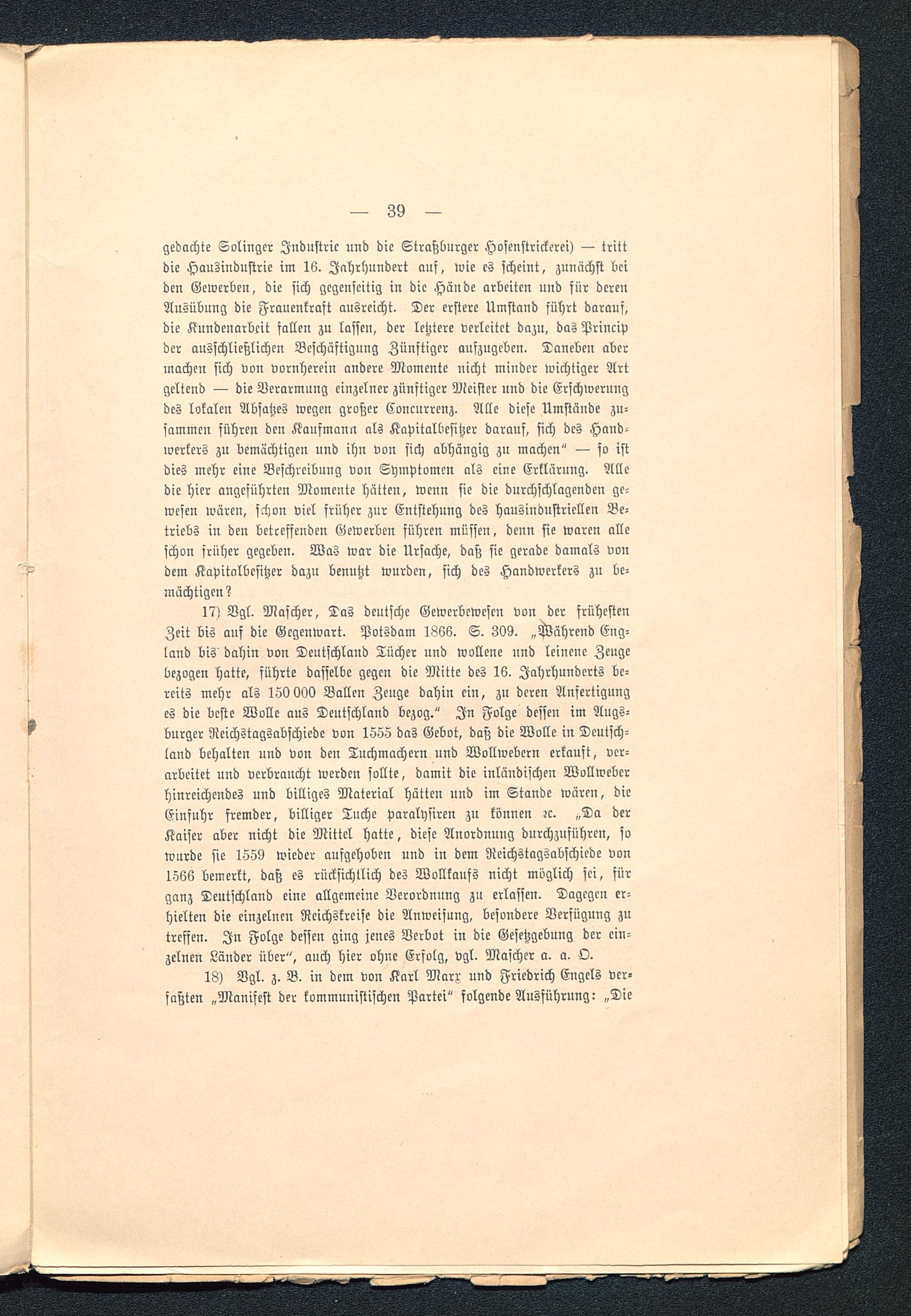 17) Vgl. Mascher, Das deutsche Gewcrbewescn von der frühestenZeit bis ans die Gegenwart. Potsdam 1866. S. 309. .Mährend Eng-land bis dahin von Deutschland Tücher und wollene nnd leinene Zeugebezogen hatte, führte dasselbe gegen die Mitte des 16. Jahrhunderts be-reits mehr als 150 (M Ballen Zeuge dahin ein, zu deren Anfertigunges die beste Wolle aus Deutschland bezog." In Folge dessen im Augs-burger Reichstagsabschiede von 1555 das Gebot, daß die Wolle in Deutsch-land behalten und von den Tuchmachern und Wollwebcrn erkauft, ver-arbeitet und verbraucht werden sollte, damit die inländischen Wollwebcrhinreichendes und billiges Material Hütten nnd im Stande wären, dieEinsuhr fremder, billiger Tnche Paralysiren zu können ?c. „Da derKaiser aber nicht die Mittel hatte, diese Anordnung durchzuführen, fowurde sie 1559 wieder aufgehoben und in dem Reichstagsabschiede von1566 bemerkt, daß es rücksichtlich des Wollkaufs nicht möglich sei, fürganz Deutschland eine allgemeine Verordnung zu erlassen. Dagegen er-hielten die einzelnen Reichskreise die Anweisung, besondere Verfügung zutreffen. In Folge dessen ging jenes Verbot in die Gesetzgebung der ein-zelnen Länder über", anch hier ohne Erfolg, vgl. Maschcr a. a. O.