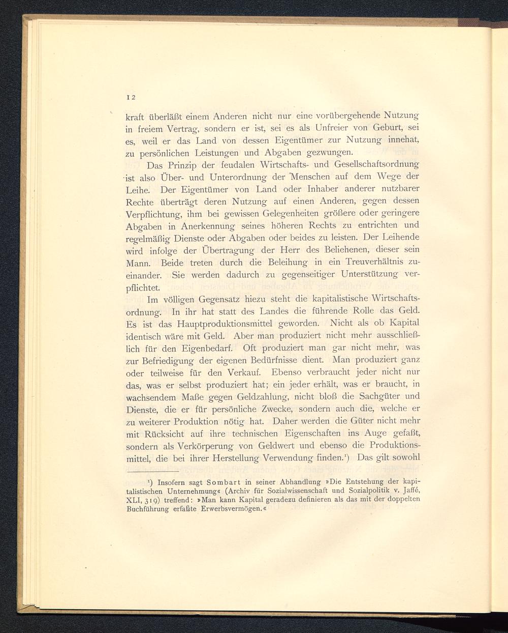 Im völligen Gegensatz hiezu steht die kapitalistische Wirtschafts-ordnung. In ihr hat statt des Landes die führende Rolle das Geld.Es ist das Hauptproduktionsmittel geworden. Nicht als ob Kapitalidentisch wäre mit Geld. Aber man produziert nicht mehr ausschließ-lich für den Eigenbedarf. Oft produziert man gar nicht mehr, waszur Befriedigung der eigenen Bedürfnisse dient. Man produziert ganzoder teilweise für den Verkauf. Ebenso verbraucht jeder nicht nurdas, was er selbst produziert hat; ein jeder erhält, was er braucht, inwachsendem Maße gegen Geldzahlung, nicht bloß die Sachgüter undDienste, die er für persönliche Zwecke, sondern auch die, welche erzu weiterer Produktion nötig hat. Daher werden die Güter nicht mehrmit Rücksicht auf ihre technischen Eigenschaften ins Auge gefaßt,sondern als Verkörperung von Geldwert und ebenso die Produktions-mittel, die bei ihrer Herstellung Verwendung finden. 1 ) Das gilt sowohl
