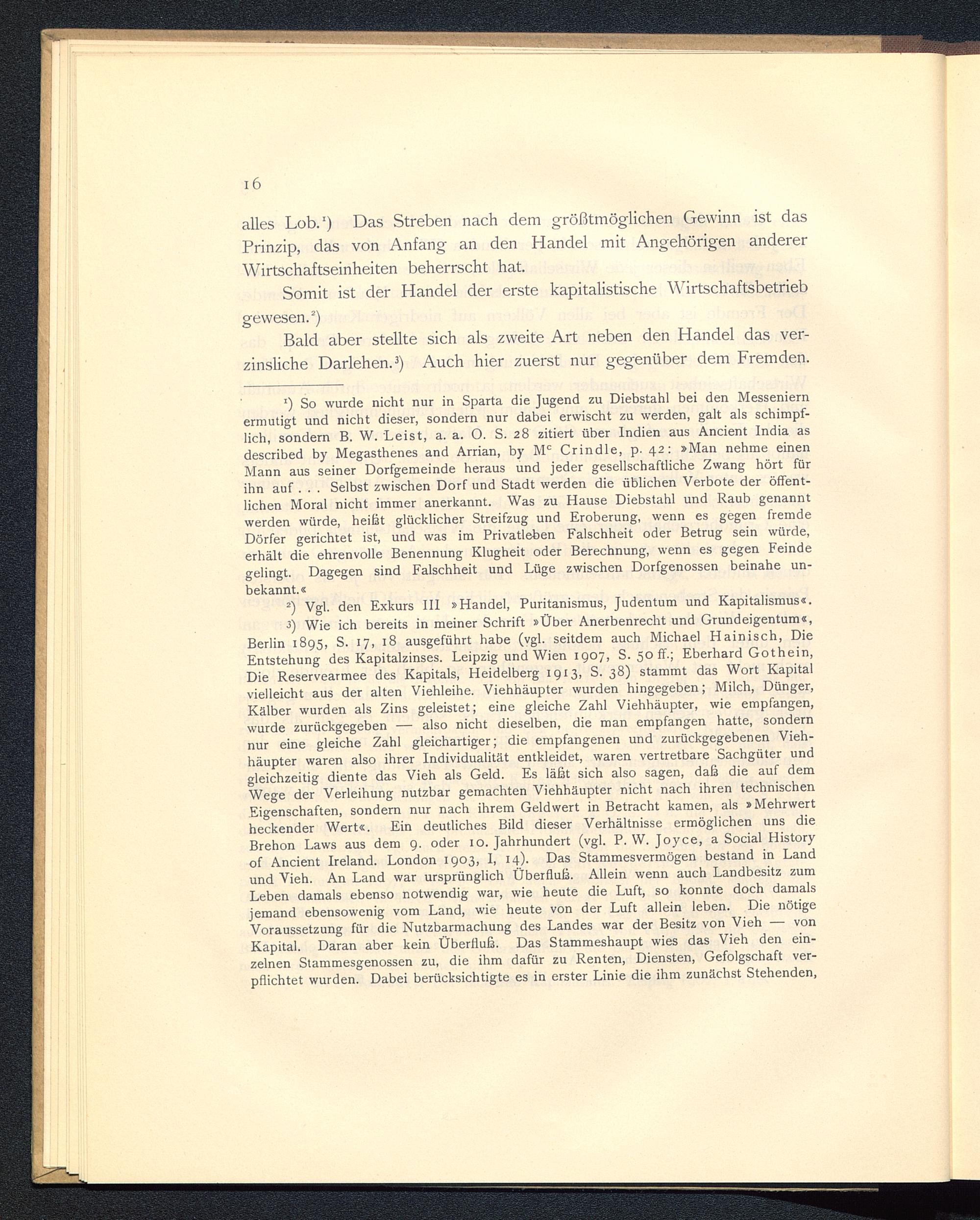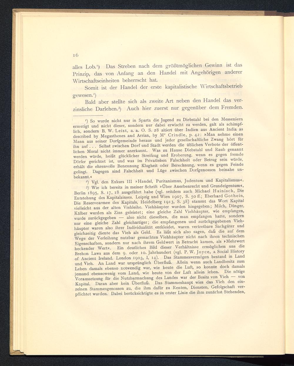 3 ) Wie ich bereits in meiner Schrift »Über Anerbenrecht und Grundeigentum«,Berlin 1895, S. 17, 18 ausgeführt habe (vgl. seitdem auch Michael Hainisch, DieEntstehung des Kapitalzinses. Leipzig und Wien 1907, S. 50 ff.; Eberhard Gothein, Die Reservearmee des Kapitals, Heidelberg 1913, S. 38) stammt das Wort Kapitalvielleicht aus der alten Viehleihe. Viehhäupter wurden hingegeben; Milch, Dünger,Kälber wurden als Zins geleistet; eine gleiche Zahl Viehhäupter, wie empfangen,wurde zurückgegeben — also nicht dieselben, die man empfangen hatte, sondernnur eine gleiche Zahl gleichartiger; die empfangenen und zurückgegebenen Vieh-häupter waren also ihrer Individualität entkleidet, waren vertretbare Sachgüter undgleichzeitig diente das Vieh als Geld. Es läßt sich also sagen, daß die auf demWege der Verleihung nutzbar gemachten Viehhäupter nicht nach ihren technischenEigenschaften, sondern nur nach ihrem Geldwert in Betracht kamen, als »Mehrwertheckender Wert«. Ein deutliches Bild dieser Verhältnisse ermöglichen uns dieBrehon Laws aus dem 9. oder 10. Jahrhundert (vgl. P. W. Joyce, a Social Historyof Ancient Ireland. London 1903, I, 14). Das Stammesvermögen bestand in Landund Vieh. An Land war ursprünglich Überfluß. Allein wenn auch Landbesitz zumLeben damals ebenso notwendig war, wie heute die Luft, so konnte doch damalsjemand ebensowenig vom Land, wie heute von der Luft allein leben. Die nötigeVoraussetzung für die Nutzbarmachung des Landes war der Besitz von Vieh — vonKapital. Daran aber kein Überfluß. Das Stammeshaupt wies das Vieh den ein-zelnen Stammesgenossen zu, die ihm dafür zu Renten, Diensten, Gefolgschaft ver-pflichtet wurden. Dabei berücksichtigte es in erster Linie die ihm zunächst Stehenden,