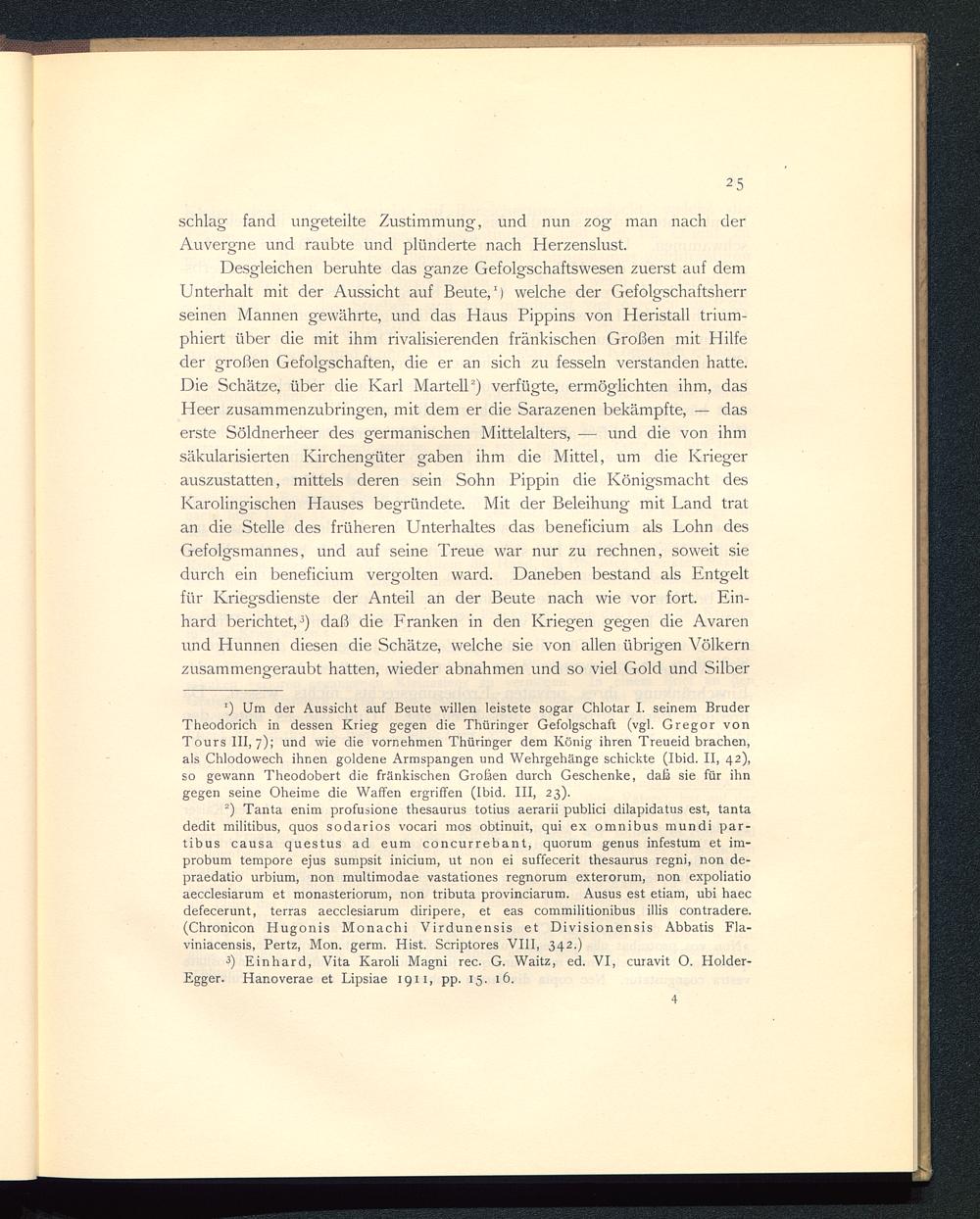 Desgleichen beruhte das ganze Gefolgschaftswesen zuerst auf demUnterhalt mit der Aussicht auf Beute, 1 ) welche der Gefolgschaftsherrseinen Mannen gewährte, und das Haus Pippins von Heristall trium-phiert über die mit ihm rivalisierenden fränkischen Großen mit Hilfeder großen Gefolgschaften, die er an sich zu fesseln verstanden hatte.Die Schätze, über die Karl Marteil 2 ) verfügte, ermöglichten ihm, dasHeer zusammenzubringen, mit dem er die Sarazenen bekämpfte, — daserste Söldnerheer des germanischen Mittelalters, — und die von ihmsäkularisierten Kirchengüter gaben ihm die Mittel, um die Kriegerauszustatten, mittels deren sein Sohn Pippin die Königsmacht desKarolingischen Hauses begründete. Mit der Beleihung mit Land tratan die Stelle des früheren Unterhaltes das beneficium als Lohn desGefolgsmannes, und auf seine Treue war nur zu rechnen, soweit siedurch ein beneficium vergolten ward. Daneben bestand als Entgeltfür Kriegsdienste der Anteil an der Beute nach wie vor fort. Ein-hard berichtet, 3 ) daß die Franken in den Kriegen gegen die Avarenund Hunnen diesen die Schätze, welche sie von allen übrigen Völkernzusammengeraubt hatten, wieder abnahmen und so viel Gold und Silber