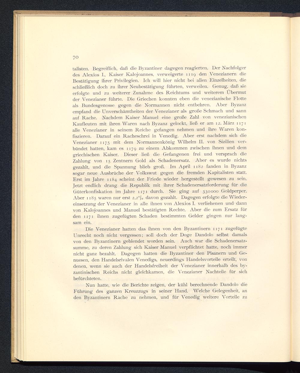 talisten. Begreiflich, daß die Byzantiner dagegen reagierten. Der Nachfolgerdes Alexios I. , Kaiser Kalojoannes, verweigerte 1119 den Venezianern dieBestätigung ihrer Privilegien. Ich will hier nicht bei allen Einzelheiten, dieschließlich doch zu ihrer Neubestätigung führten, verweilen. Genug, daß sieerfolgte und zu weiterer Zunahme des Reichtums und weiterem Übermutder Venezianer führte. Die Griechen konnten eben die venezianische Flotteals Bundesgenosse gegen die Normannen nicht entbehren. Aber Byzanzempfand die Unverschämtheiten der Venezianer als große Schmach und sannauf Rache. Nachdem Kaiser Manuel eine große Zahl von venezianischenKaufleuten mit ihren Waren nach Byzanz gelockt, ließ er am 12. März 1171alle Venezianer in seinem Reiche gefangen nehmen und ihre Waren kon-fiszieren. Darauf ein Racheschrei in Venedig. Aber erst nachdem sich dieVenezianer 1175 mit dem Normannenkönig Wilhelm II. von Sizilien ver-bündet hatten, kam es 1179 zu einem Abkommen zwischen ihnen und demgriechischen Kaiser. Dieser ließ die Gefangenen frei und versprach dieZahlung von 15 Zentnern Gold als Schadenersatz. Aber es wurde nichtsgezahlt, und die Spannung blieb groß. Im April 1182 fanden in Byzanzsogar neue Ausbrüche der Volkswut gegen die fremden Kapitalisten statt.Erst im Jahre 1184 scheint der Friede wieder hergestellt gewesen zu sein.Jetzt endlich drang die Republik mit ihrer Schadenersatzforderung für dieGüterkonfiskation im Jahre 1171 durch. Sie ging auf 330000 Goldperper.Aber 1185 waren nur erst 2,2°/ 0 davon gezahlt. Dagegen erfolgte die Wieder-einsetzung der Venezianer in alle ihnen von Alexios I. verliehenen und dannvon Kalojoannes und Manuel bestätigten Rechte. Aber die zum Ersatz fürden 1171 ihnen zugefügten Schaden bestimmten Gelder gingen nur lang-sam ein.