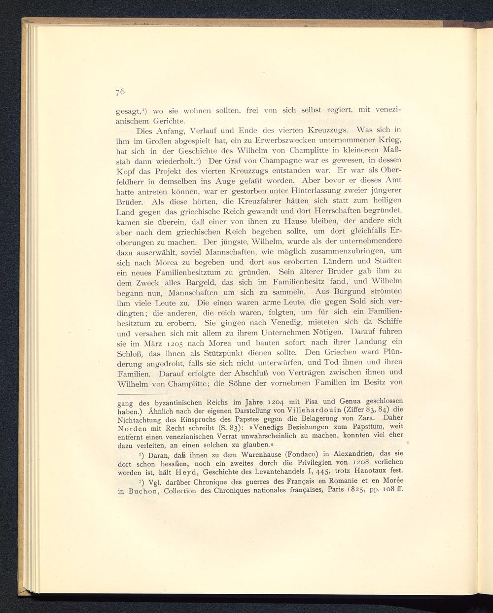 gang des byzantinischen Reichs im Jahre 1204 mit Pisa und Genua geschlossenhaben.) Ähnlich nach der eigenen Darstellung von Villehardouin (Ziffer 83, 84) dieNichtachtung des Einspruchs des Papstes gegen die Belagerung von Zara . DaherNorden mit Recht schreibt (S. 83): »Venedigs Beziehungen zum Papsttum, weitentfernt einen venezianischen Verrat unwahrscheinlich zu machen, konnten viel eherdazu verleiten, an einen solchen zu glauben.«