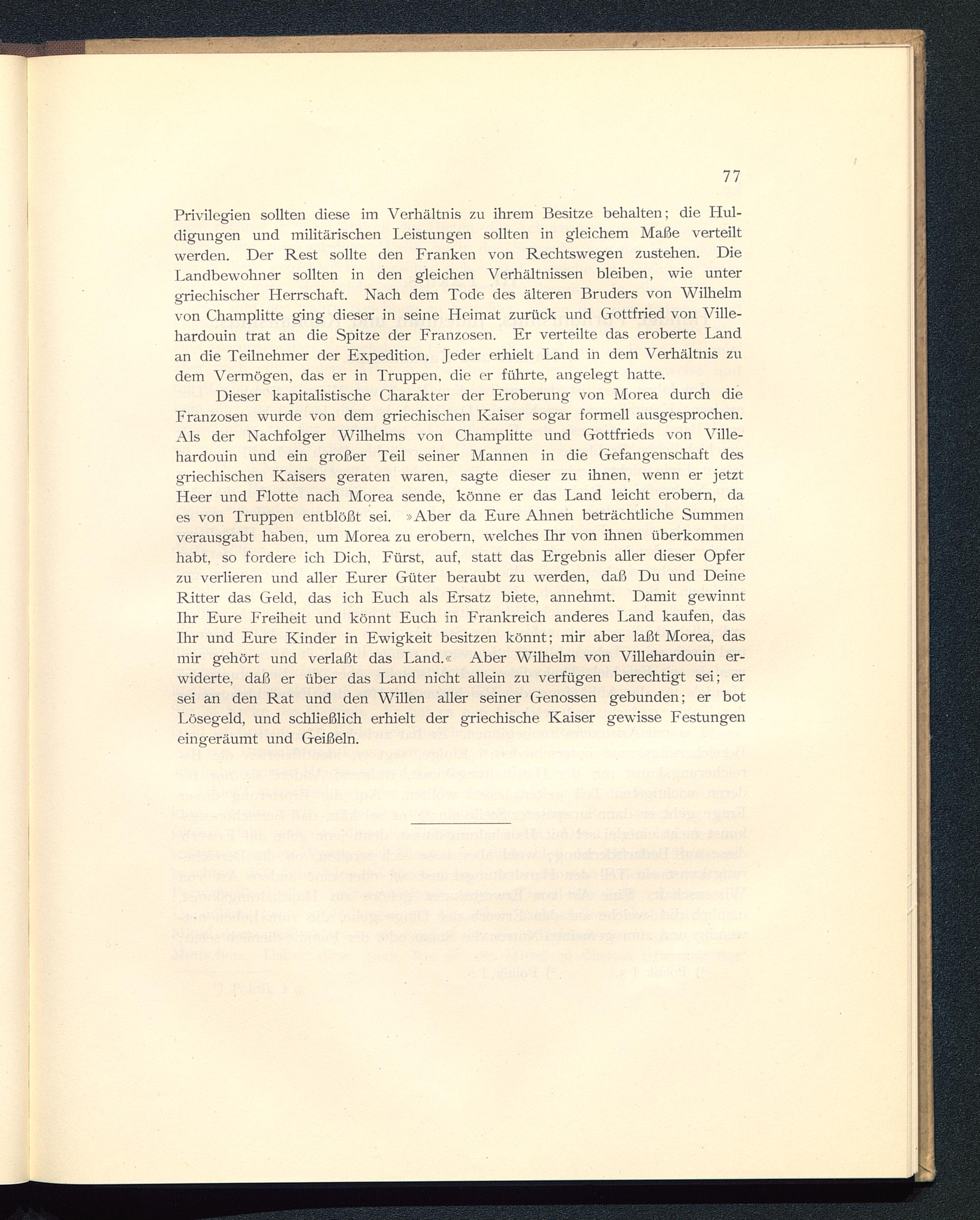 Dieser kapitalistische Charakter der Eroberung von Morea durch dieFranzosen wurde von dem griechischen Kaiser sogar formell ausgesprochen.Als der Nachfolger Wilhelms von Champlitte und Gottfrieds von Ville-hardouin und ein großer Teil seiner Mannen in die Gefangenschaft desgriechischen Kaisers geraten waren, sagte dieser zu ihnen, wenn er jetztHeer und Flotte nach Morea sende, könne er das Land leicht erobern, daes von Truppen entblößt sei. »Aber da Eure Almen beträchtliche Summenverausgabt haben, um Morea zu erobern, welches Ihr von ihnen überkommenhabt, so fordere ich Dich, Fürst, auf, statt das Ergebnis aller dieser Opferzu verlieren und aller Eurer Güter beraubt zu werden, daß Du und DeineRitter das Geld, das ich Euch als Ersatz biete, annehmt. Damit gewinntIhr Eure Freiheit und könnt Euch in Frankreich anderes Land kaufen, dasThr und Eure Kinder in Ewigkeit besitzen könnt; mir aber laßt Morea, dasmir gehört und verlaßt das Land.« Aber Wilhelm von Villehardouin er-widerte, daß er über das Land nicht allein zu verfügen berechtigt sei; ersei an den Rat und den Willen aller seiner Genossen gebunden; er botLösegeld, und schließlich erhielt der griechische Kaiser gewisse Festungeneingeräumt und Geißeln.