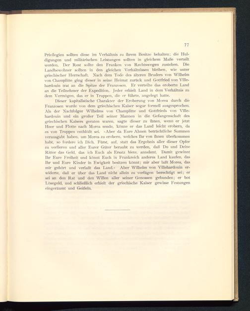 Privilegien sollten diese im Verhältnis zu ihrem Besitze behalten; die Hul-digungen und militärischen Leistungen sollten in gleichem Maße verteiltwerden. Der Rest sollte den Franken von Rechtswegen zustehen. DieLandbewohner sollten in den gleichen Verhältnissen bleiben, wie untergriechischer Herrschaft. Nach dem Tode des älteren Bruders von Wilhelmvon Champlitte ging dieser in seine Heimat zurück und Gottfried von Ville-hardouin trat an die Spitze der Franzosen . Er verteilte das eroberte Landan die Teilnehmer der Expedition. Jeder erhielt Land in dem Verhältnis zudem Vermögen, das er in Truppen, die er führte, angelegt hatte.