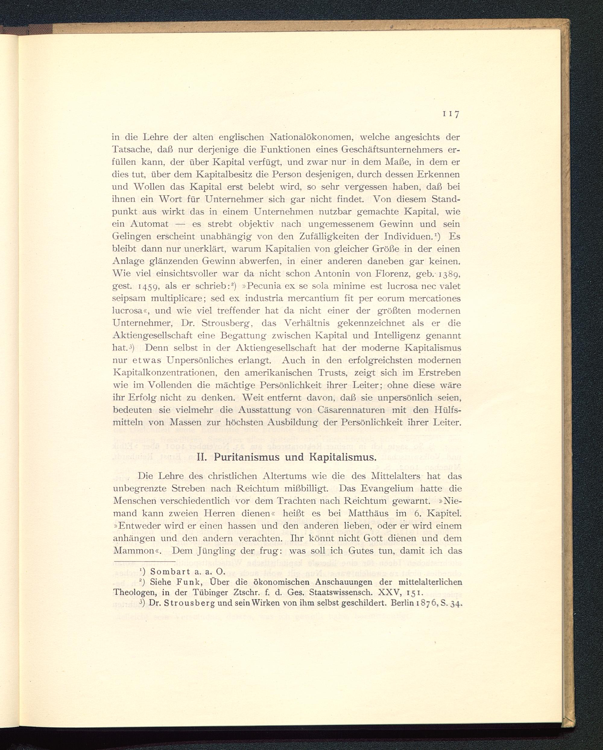 in die Lehre der alten englischen Nationalökonomen, welche angesichts derTatsache, daß nur derjenige die Funktionen eines Geschäftsunternehmers er-füllen kann, der über Kapital verfügt, und zwar nur in dem Maße, in dem erdies tut, über dem Kapitalbesitz die Person desjenigen, durch dessen Erkennenund Wollen das Kapital erst belebt wird, so sehr vergessen haben, daß beiihnen ein Wort für Unternehmer sich gar nicht findet. Von diesem Stand-punkt aus wirkt das in einem Unternehmen nutzbar gemachte Kapital, wieein Automat — es strebt objektiv nach ungemessenem Gewinn und seinGelingen erscheint unabhängig von den Zufälligkeiten der Individuen. 1 ) Esbleibt dann nur unerklärt, warum Kapitalien von gleicher Größe in der einenAnlage glänzenden Gewinn abwerfen, in einer anderen daneben gar keinen.Wie viel einsichtsvoller war da nicht schon Antonin von Florenz , geb. 1389,gest. 1459, a l s er schrieb: 2 ) »Pecunia ex se sola minime est lucrosa nec valetseipsam multiplicare; sed ex industria mercantium fit per eorum mercationeslucrosa«, und wie viel treffender hat da nicht einer der größten modernenUnternehmer, Dr. Strousberg, das Verhältnis gekennzeichnet als er dieAktiengesellschaft eine Begattung zwischen Kapital und Intelligenz genannthat. 3 ) Denn selbst in der Aktiengesellschaft hat der moderne Kapitalismusnur etwas Unpersönliches erlangt. Auch in den erfolgreichsten modernenKapitalkonzentrationen, den amerikanischen Trusts, zeigt sich im Erstrebenwie im Vollenden die mächtige Persönlichkeit ihrer Leiter; ohne diese wäreihr Erfolg nicht zu denken. Weit entfernt davon, daß sie unpersönlich seien,bedeuten sie vielmehr die Ausstattung von Cäsarennaturen mit den Hülfs-mitteln von Massen zur höchsten Ausbildung der Persönlichkeit ihrer Leiter.