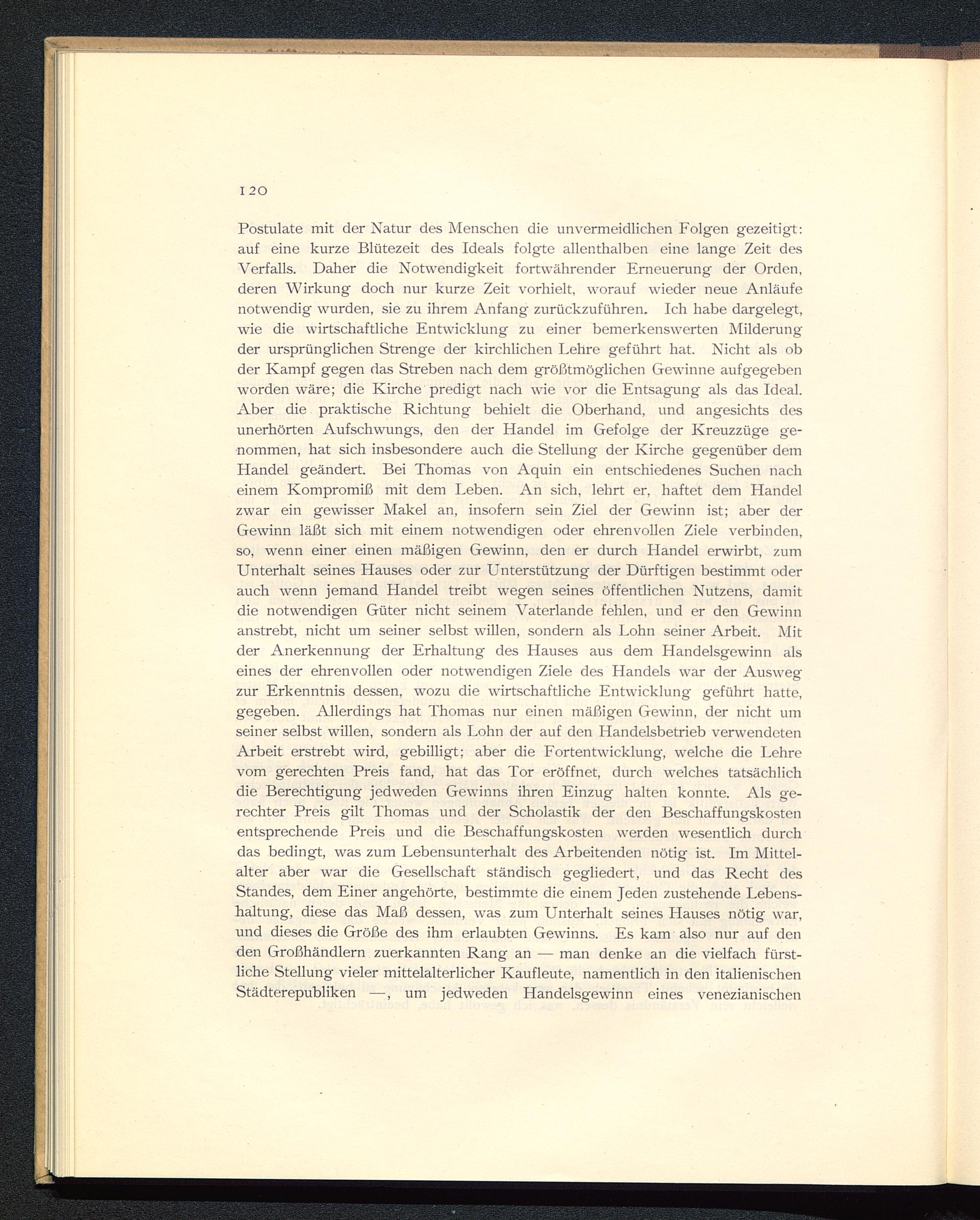 Postulate mit der Natur des Menschen die unvermeidlichen Folgen gezeitigt:auf eine kurze Blütezeit des Ideals folgte allenthalben eine lange Zeit desVerfalls. Daher die Notwendigkeit fortwährender Erneuerung der Orden,deren Wirkung doch nur kurze Zeit vorhielt, worauf wieder neue Anläufenotwendig wurden, sie zu ihrem Anfang zurückzuführen. Ich habe dargelegt,wie die wirtschaftliche Entwicklung zu einer bemerkenswerten Milderungder ursprünglichen Strenge der kirchlichen Lehre geführt hat. Nicht als obder Kampf gegen das Streben nach dem größtmöglichen Gewinne aufgegebenworden wäre; die Kirche predigt nach wie vor die Entsagung als das Ideal.Aber die praktische Richtung behielt die Oberhand, und angesichts desunerhörten Aufschwungs, den der Handel im Gefolge der Kreuzzüge ge-nommen, hat sich insbesondere auch die Stellung der Kirche gegenüber demHandel geändert. Bei Thomas von Aquin ein entschiedenes Suchen nacheinem Kompromiß mit dem .Leben. An sich, lehrt er, haftet dem Handelzwar ein gewisser Makel an, insofern sein Ziel der Gewinn ist; aber derGewinn läßt sich mit einem notwendigen oder ehrenvollen Ziele verbinden,so, wenn einer einen mäßigen Gewinn, den er durch Llandel erwirbt, zumUnterhalt seines Hauses oder zur Unterstützung der Dürftigen bestimmt oderauch wenn jemand Handel treibt wegen seines öffentlichen Nutzens, damitdie notwendigen Güter nicht seinem Vaterlande fehlen, und er den Gewinnanstrebt, nicht um seiner selbst willen, sondern als Lohn seiner Arbeit. Mitder Anerkennung der Erhaltung des Hauses aus dem Handelsgewinn alseines der ehrenvollen oder notwendigen Ziele des Handels war der Auswegzur Erkenntnis dessen, wozu die wirtschaftliche Entwicklung geführt hatte,gegeben. Allerdings hat Thomas nur einen mäßigen Gewinn, der nicht umseiner selbst willen, sondern als Lohn der auf den Handelsbetrieb verwendetenArbeit erstrebt wird, gebilligt; aber die Fortentwicklung, welche die Lehrevom gerechten Preis fand, hat das Tor eröffnet, durch welches tatsächlichdie Berechtigung jedweden Gewinns ihren Einzug halten konnte. Als ge-rechter Preis gilt Thomas und der Scholastik der den Beschaffungskostenentsprechende Preis und die Beschaffungskosten werden wesentlich durchdas bedingt, was zum Lebensunterhalt des Arbeitenden nötig ist. Im Mittel-alter aber war die Gesellschaft ständisch gegliedert, und das Recht desStandes, dem Einer angehörte, bestimmte die einem Jeden zustehende Lebens-haltung, diese das Maß dessen, was zum Unterhalt seines Hauses nötig war,und dieses die Größe des ihm erlaubten Gewinns. Es kam also nur auf denden Großhändlern zuerkannten Rang an — man denke an die vielfach fürst-liche Stellung vieler mittelalterlicher Kaufleute, namentlich in den italienischenStädterepubliken —, um jedweden Handelsgewinn eines venezianischen