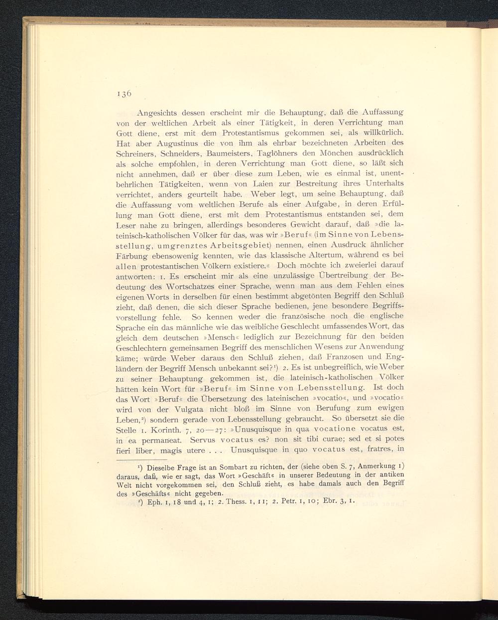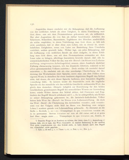 Angesichts dessen erscheint mir die Behauptung, daß die Auffassungvon der weltlichen Arbeit als einer Tätigkeit, in deren Verrichtung manGott diene, erst mit dem Protestantismus gekommen sei, als willkürlich.Hat aber Augustinus die von ihm als ehrbar bezeichneten Arbeiten desSchreiners, Schneiders, Baumeisters, Taglöhners den Mönchen ausdrücklichals solche empfohlen, in deren Verrichtung man Gott diene, so läßt sichnicht annehmen, daß er über diese zum Leben, wie es einmal ist, unent-behrlichen Tätigkeiten, wenn von Laien zur Bestreitung ihres Unterhaltsverrichtet, anders geurteilt habe. Weber legt, um seine Behauptung, daßdie Auffassung vom weltlichen Berufe als einer Aufgabe, in deren Erfül-lung man Gott diene, erst mit dem Protestantismus entstanden sei, demLeser nahe zu bringen, allerdings besonderes Gewicht darauf, daß »die la-teinisch-katholischen Völker für das, was wir »Beruf« (im Sinne von Lebens-stellung, umgrenztes Arbeitsgebiet) nennen, einen Ausdruck ähnlicherFärbung ebensowenig kennten, wie das klassische Altertum, während es beiallen protestantischen Völkern existiere.« Doch möchte ich zweierlei daraufantworten: i. Es erscheint mir als eine unzulässige Übertreibung der Be-deutung des Wortschatzes einer Sprache, wenn man aus dem Fehlen eineseigenen Worts in derselben für einen bestimmt abgetönten Begriff den Schlußzieht, daß denen, die sich dieser Sprache bedienen, jene besondere Begriffs-vorstellung fehle. So kennen weder die französische noch die englischeSprache ein das männliche wie das weibliche Geschlecht umfassendes Wort, dasgleich dem deutschen »Mensch« lediglich zur Bezeichnung für den beidenGeschlechtern gemeinsamen Begriff des menschlichen Wesens zur Anwendungkäme; würde Weber daraus den Schluß ziehen, daß Franzosen und Eng-ländern der Begriff Mensch unbekannt sei? 1 ) 2. Es ist unbegreiflich, wie Weberzu seiner Behauptung gekommen ist, die lateinisch-katholischen Völkerhätten kein Wort für »Beruf« im Sinne von Lebensstellung. Ist dochdas Wort »Beruf« die Übersetzung des lateinischen »vocatio«, und »vocatio«wird von der Vulgata nicht bloß im Sinne von Berufung zum ewigenLeben, 2 ) sondern gerade von Lebensstellung gebraucht. So übersetzt sie dieStelle x. Korinth. 7, 20 — 27: »Unusquisque in qua vocatione vocatus est,in ea permaneat. Servus vocatus es? non sit tibi curae; sed et si potesfieri über, magis utere . . . Unusquisque in quo vocatus est, fratres, in