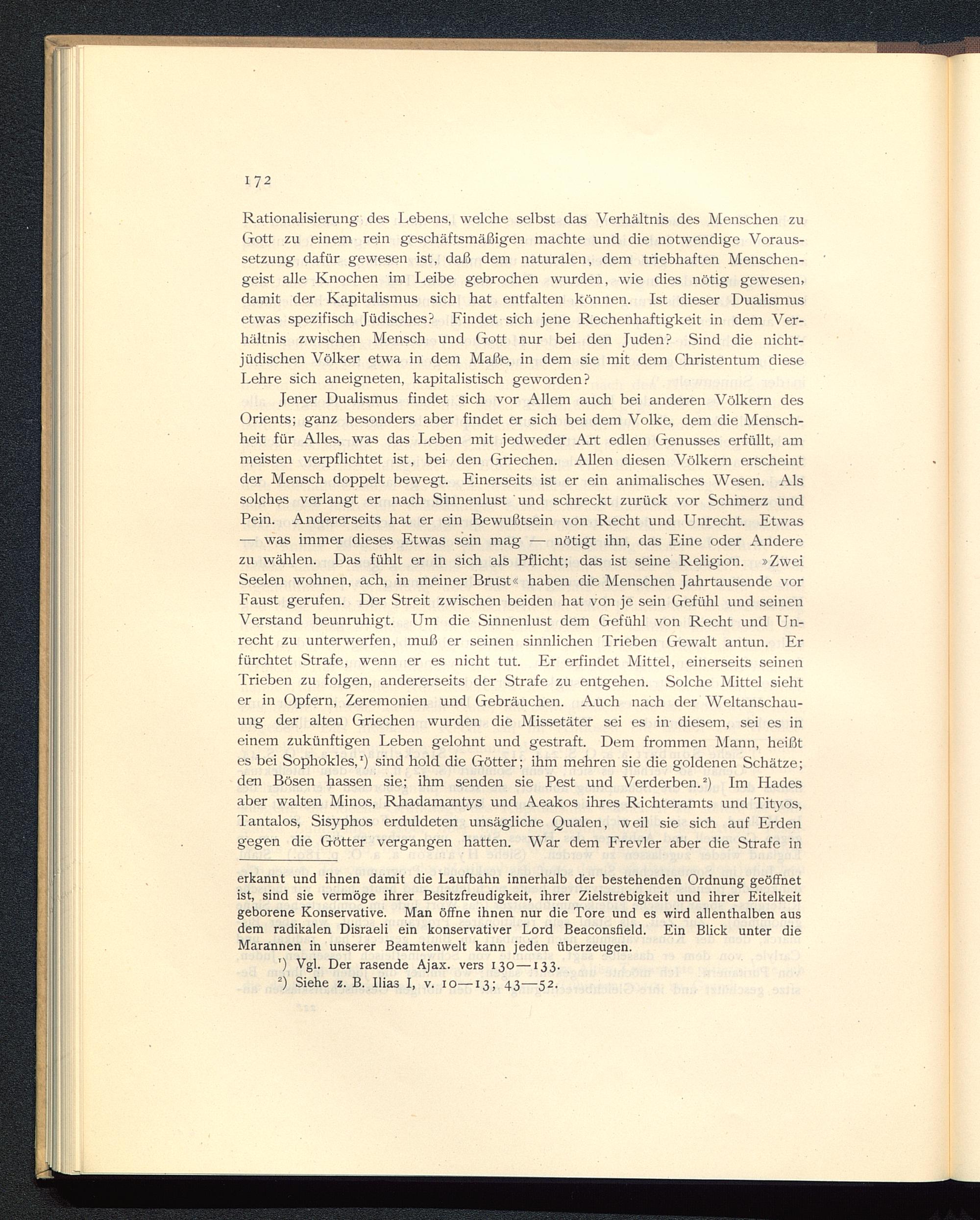 Rationalisierung des Lebens, welche selbst das Verhältnis des Menschen zuGott zu einem rein geschäftsmäßigen machte und die notwendige Voraus-setzung dafür gewesen ist, daß dem naturalen, dem triebhaften Menschen-geist alle Knochen im Leibe gebrochen wurden, wie dies nötig gewesen,damit der Kapitalismus sich hat entfalten können. Ist dieser Dualismusetwas spezifisch Jüdisches? Findet sich jene Rechenhaftigkeit in dem Ver-hältnis zwischen Mensch und Gott nur bei den Juden? Sind die nicht-jüdischen Völker etwa in dem Maße, in dem sie mit dem Christentum dieseLehre sich aneigneten, kapitalistisch geworden?