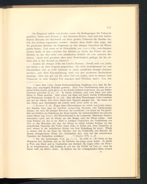 nennen, wie etwa die heutigen Bewohner der Lombardei , von denen ein Teil gleich-falls aus Schäfern am Südabhang der Alpen besteht, die umherschweifend ein schweresLeben führen (vgl. Gor io, Die Milchwirtschaft in der Lombardei . Münchener Doktor-dissertation 1900) und im Herbst aus den Bergen nach der Ebene ziehen. Undwenn Sombart aus den in der Bibel so häufigen Vergleichen des Verhältnisses vonGott zu den Menschen mit dem des Hirten zu seinen Schafen Schlüsse auf dennomadischen Charakter des Volkes Israel zieht, so finden sich diese Vergleiche janoch ebenso in der katholischen Kirche von ihrer Entstehung bis heute. Würdeer daraus, daß ihr der Papst der Oberhirt, und die Erzbischöfe und Bischöfe diediesem untergeordnete Hirten der Christenheit sind, etwa auf den nomadischenCharakter der Katholiken schließen? 3 ) Strabo XVI, 2, 36.