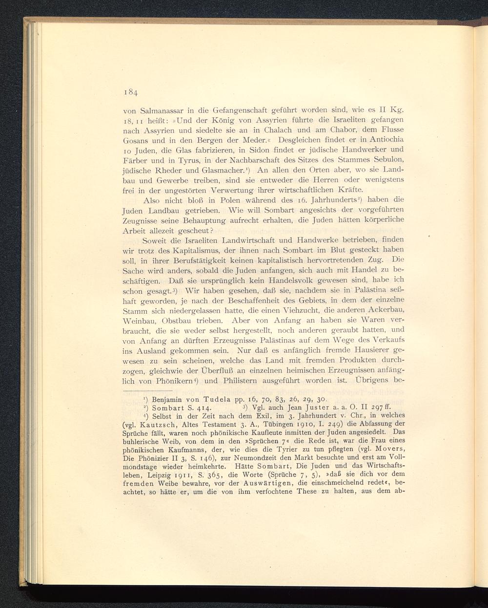 4 ) Selbst in der Zeit nach dem Exil, im 3. Jahrhundert v. Chr., in welches(vgl. Kautzsch, Altes Testament 3. A., Tübingen 1910, I. 249) die Abfassung derSprüche fällt, waren noch phönikische Kaufleute inmitten der Juden angesiedelt. Dasbuhlerische Weib, von dem in den »Sprüchen 7« die Rede ist, war die Frau einesphönikischen Kaufmanns, der, wie dies die Tyrier zu tun pflegten (vgl. Movers,Die Phönizier II 3, S. 146), zur Neumondzeit den Markt besuchte und erst am Voll-mondstage wieder heimkehrte. Hätte Sombart , Die Juden und das Wirtschafts-leben, Leipzig 1911, S. 365, die Worte (Sprüche 7, 5), »daß sie dich vor demfremden Weibe bewahre, vor der Auswärtigen, die einschmeichelnd redet«, be-achtet, so hätte er, um die von ihm verfochtene These zu halten, aus dem ab-