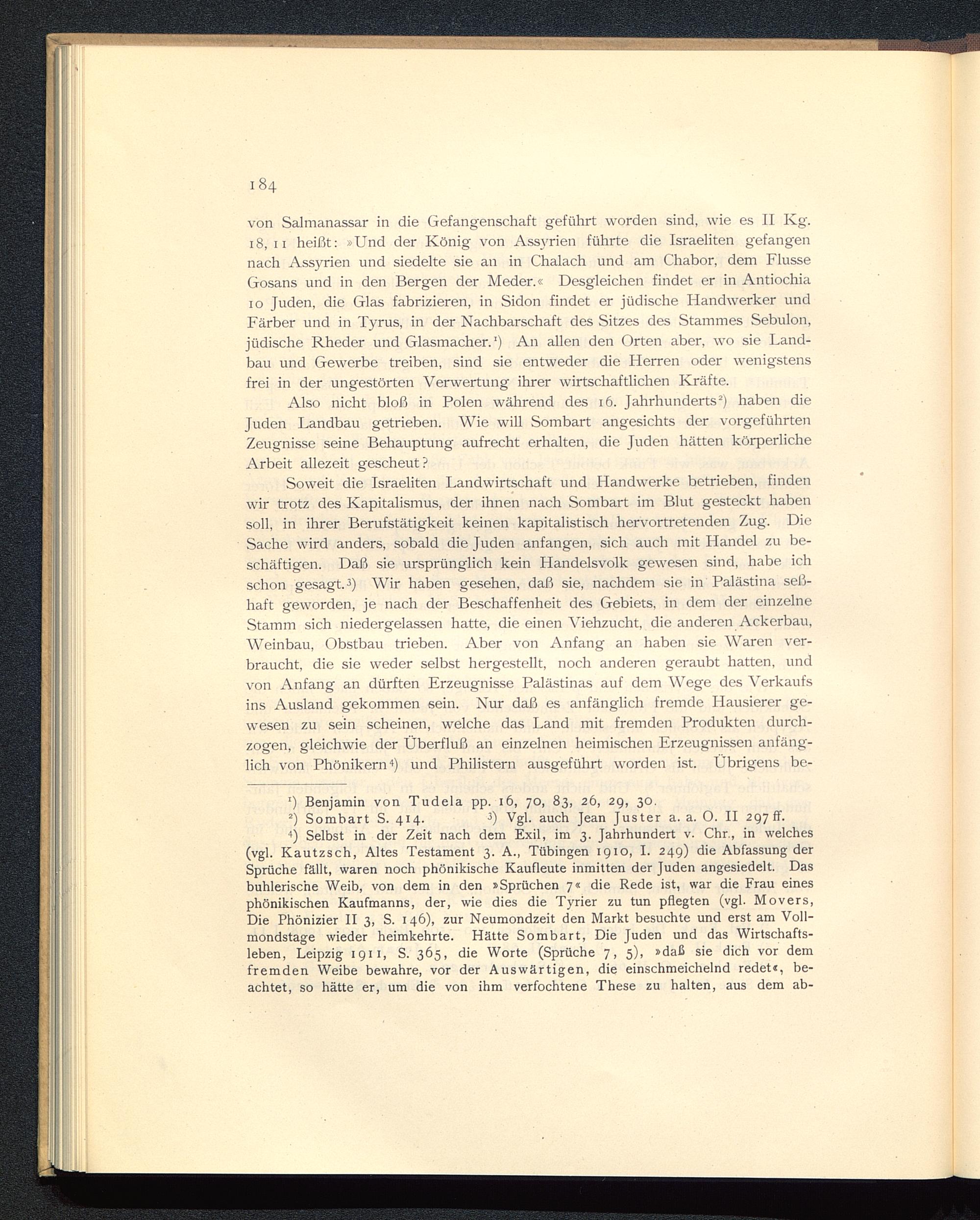 Soweit die Israeliten Landwirtschaft und Handwerke betrieben, findenwir trotz des Kapitalismus, der ihnen nach Sombart im Blut gesteckt habensoll, in ihrer Berufstätigkeit keinen kapitalistisch hervortretenden Zug. DieSache wird anders, sobald die Juden anfangen, sich auch mit Plandel zu be-schäftigen. Daß sie ursprünglich kein Handelsvolk gewesen sind, habe ichschon gesagt. 3 ) Wir haben gesehen, daß sie, nachdem sie in Palästina seß-haft geworden, je nach der Beschaffenheit des Gebiets, in dem der einzelneStamm sich niedergelassen hatte, die einen Viehzucht, die anderen Ackerbau,Weinbau, Obstbau trieben. Aber von Anfang an haben sie Waren ver-braucht, die sie weder selbst hergestellt, noch anderen geraubt hatten, undvon Anfang an dürften Erzeugnisse Palästinas auf dem Wege des Verkaufsins Ausland gekommen sein. Nur daß es anfänglich fremde Hausierer ge-wesen zu sein scheinen, welche das Land mit fremden Produkten durch-zogen, gleichwie der Überfluß an einzelnen heimischen Erzeugnissen anfäng-lich von Phönikern 4 ) und Philistern ausgeführt worden ist. Übrigens be-