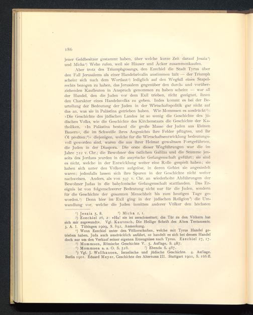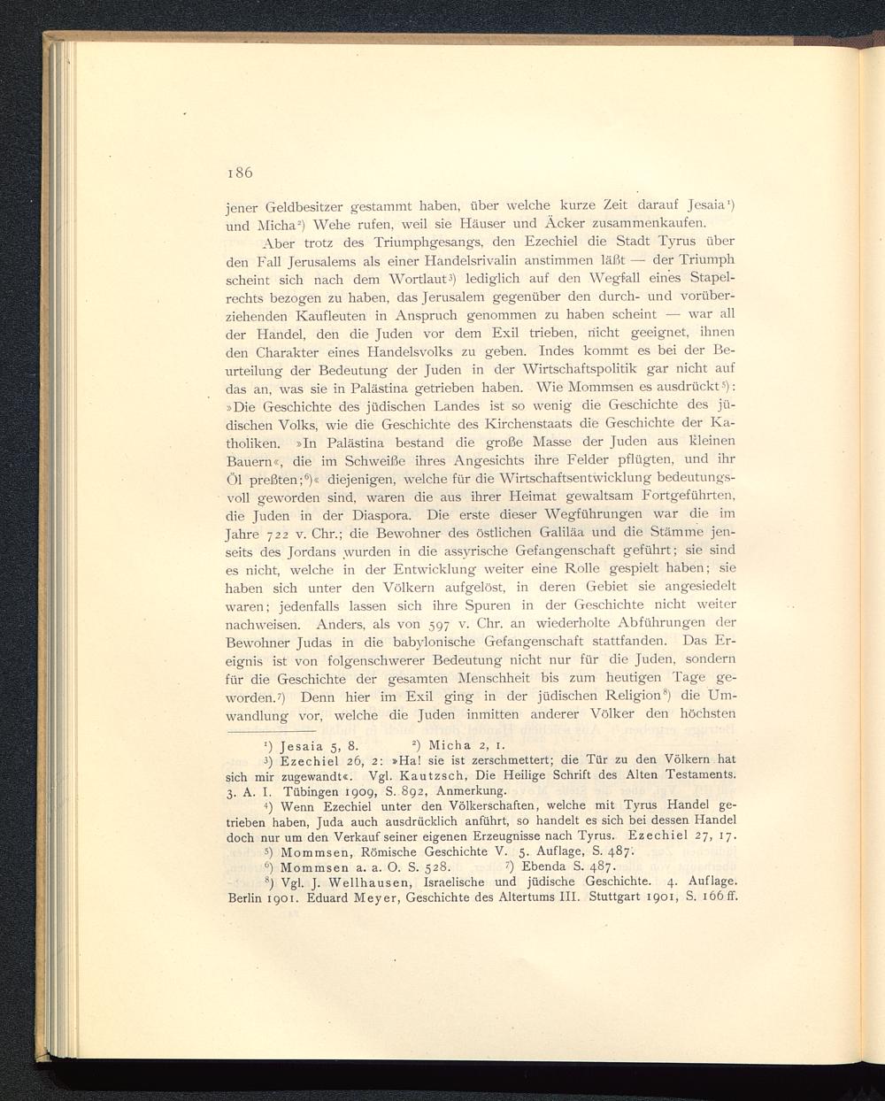 Aber trotz des Triumphgesangs, den Ezechiel die Stadt Tyrus überden Fall Jerusalems als einer Handelsrivalin anstimmen läßt —■ der Triumphscheint sich nach dem Wortlaut 3 ) lediglich auf den Wegfall eines Stapel-rechts bezogen zu haben, das Jerusalem gegenüber den durch- und vorüber-ziehenden Kaufleuten in Anspruch genommen zu haben scheint — war allder Handel, den die Juden vor dem Exil trieben, nicht geeignet, ihnenden Charakter eines Handelsvolks zu geben. Indes kommt es bei der Be-urteilung der Bedeutung der Juden in der Wirtschaftspolitik gar nicht aufdas an, was sie in Palästina getrieben haben. Wie Mommsen es ausdrückt 5 ):»Die Geschichte des jüdischen Landes ist so wenig die Geschichte des jü-dischen Volks, wie die Geschichte des Kirchenstaats die Geschichte der Ka-tholiken. »In Palästina bestand die große Masse der Juden aus kleinenBauern«, die im Schweiße ihres Angesichts ihre Felder pflügten, und ihrÖl preßten; 6 )« diejenigen, welche für die Wirtschaftsentwicklung bedeutungs-voll geworden sind, waren die aus ihrer Heimat gewaltsam Fortgeführten,die Juden in der Diaspora. Die erste dieser Wegführungen war die imJahre 722 v. Chr.; die Bewohner des östlichen Galiläa und die Stämme jen-seits des Jordans wurden in die assyrische Gefangenschaft geführt; sie sindes nicht, welche in der Entwicklung weiter eine Rolle gespielt haben; siehaben sich unter den Völkern aufgelöst, in deren Gebiet sie angesiedeltwaren; jedenfalls lassen sich ihre Spuren in der Geschichte nicht weiternachweisen. Anders, als von 597 v. Chr. an wiederholte Abführungen derBewohner Judas in die babylonische Gefangenschaft stattfanden. Das Er-eignis ist von folgenschwerer Bedeutung nicht nur für die Juden, sondernfür die Geschichte der gesamten Menschheit bis zum heutigen Tage ge-worden.?) Denn hier im Exil ging in der jüdischen Religion 8 ) die Um-wandlung vor, welche die Juden inmitten anderer Völker den höchsten