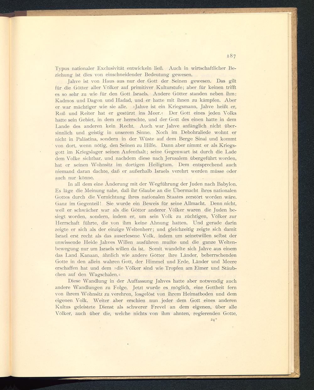 Diese Wandlung in der Auffassung Jahves hatte aber notwendig auchandere Wandlungen zu Folge. Jetzt wurde es möglich, eine Gottheit fernvon ihrem Wohnsitz zu verehren, losgelöst von ihrem Heimatboden und demeigenen Volk. Weiter aber erschien nun jeder dem Gott eines anderenKultus geleistete Dienst als schwerer Frevel an dem eigenen, über alleVölker, auch über die, welche nichts von ihm ahnten, regierenden Gotte,
