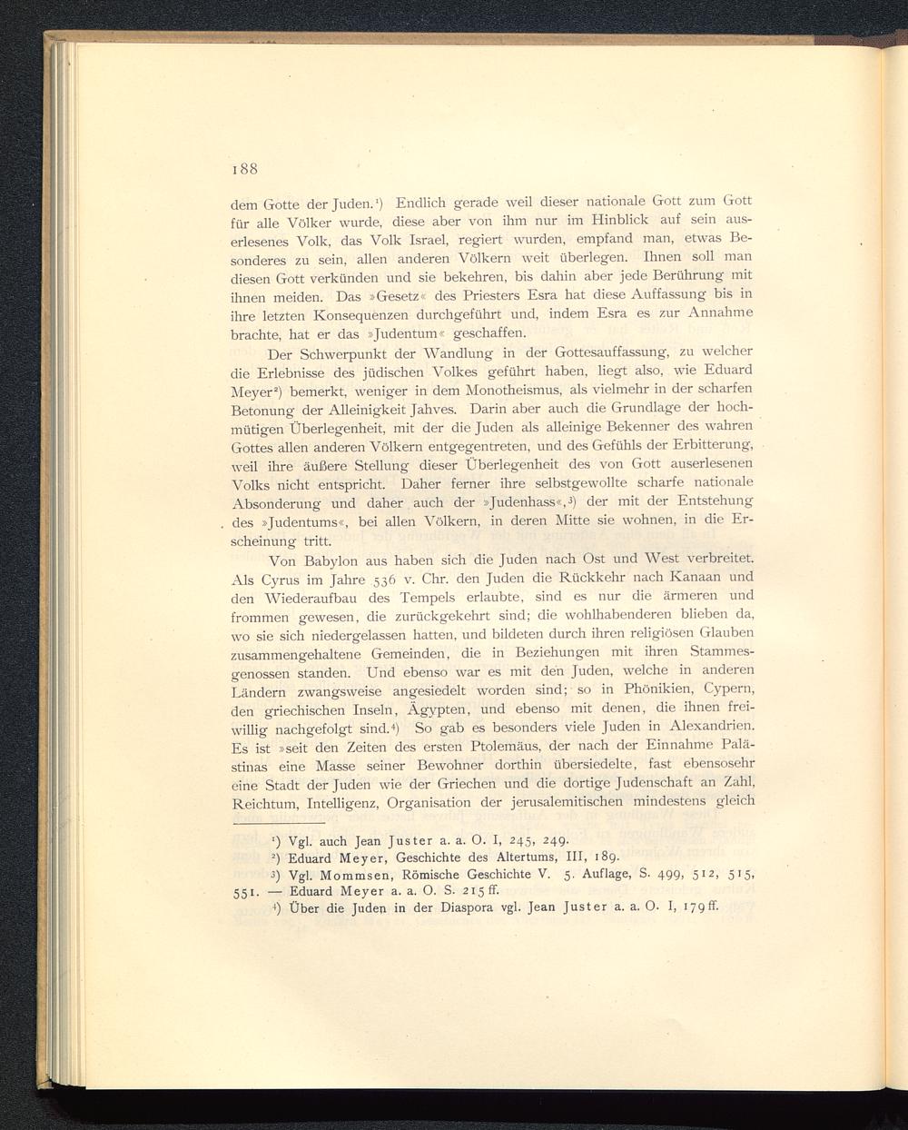Von Babylon aus haben sich die Juden nach Ost und West verbreitet.Als Cyrus im Jahre 536 v. Chr. den Juden die Rückkehr nach Kanaan undden Wiederaufbau des Tempels erlaubte, sind es nur die ärmeren undfrommen gewesen, die zurückgekehrt sind; die wohlhabenderen blieben da,wo sie sich niedergelassen hatten, und bildeten durch ihren religiösen Glaubenzusammengehaltene Gemeinden, die in Beziehungen mit ihren Stammes-genossen standen. Und ebenso war es mit den Juden, welche in anderenLändern zwangsweise angesiedelt worden sind; so in Phönikien, Cypern,den griechischen Inseln, Ägypten , und ebenso mit denen, die ihnen frei-willig nachgefolgt sind. 4 ) So gab es besonders viele Juden in Alexandrien .Es ist »seit den Zeiten des ersten Ptolemäus, der nach der Einnahme Palä-stinas eine Masse seiner Bewohner dorthin übersiedelte, fast ebensosehreine Stadt der Juden wie der Griechen und die dortige Judenschaft an Zahl,Reichtum, Intelligenz, Organisation der jerusalemitischen mindestens gleich